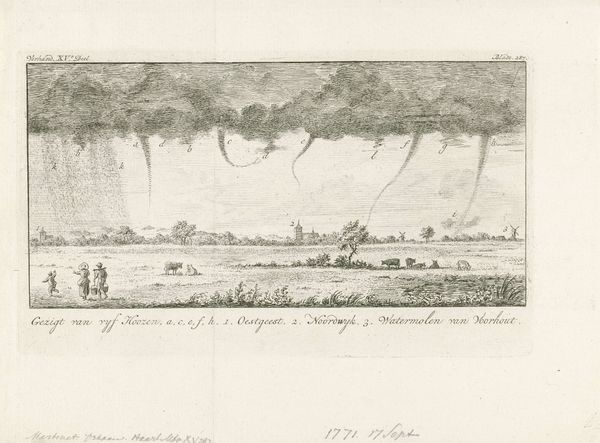 Curator: Jan Heinis te Zaandijk's print, titled “Dijkdoorbraak bj Wijdewormer, 1825," presents us with a moment of devastation captured in engraving. Created in 1825, the work depicts the aftermath of a dike breach in Wijdewormer. Editor: The somber tone is unmistakable. It's spare, yet emotionally laden. The artist really emphasizes that massive sky... those threatening clouds almost overpower the delicate lines depicting the flooded landscape below. Curator: The stark realism here is striking. We must consider the context of 19th-century Holland; these breaches were a constant threat. It’s not just a pretty picture; it's a socio-political record, speaking to a community vulnerable to the forces of nature. Editor: Precisely! It speaks to power dynamics, doesn't it? The land is something they’ve labored to control, only to be reminded of their limitations. Look at the way people are clustered on the remaining banks – observing or waiting; powerless figures negotiating the impact of that trauma. Curator: The composition itself plays with the idea of control. The horizon line sits quite low, amplifying the sense of an expansive, almost overwhelming environment pressing down on the survivors. Editor: And the detail. Consider what's missing from those communities on the banks, likely devastated due to social and financial consequences. How does this moment shape their identity and resilience in the face of these adversities? Curator: Absolutely. Art like this serves as a vital link to our past, providing insight into how communities coped with ecological disasters and demonstrating how these events influenced social structures and government policies. Editor: It invites reflection on how historical vulnerabilities resonate in our own era. From class issues to social disparities and climate challenges, it’s more crucial than ever that we consider our human impact, social responsibility, and political landscapes reflected across these past, present, and future histories. Curator: Ultimately, this engraving encourages us to reconsider our relationship with nature. It offers an unvarnished view of the past. Editor: And to critically engage with the power dynamics that continue to define the landscapes of our future.