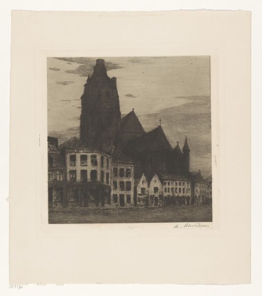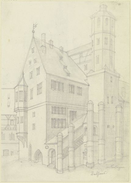 Curator: Before us is "Het Raadhuis, met de Roelant, van Halberstadt," possibly created in 1867 by Jan Striening. It’s rendered in pencil, capturing a cityscape scene. Editor: My immediate impression is one of quiet solemnity. The tonal range is subtle, the lines delicate, and the composition centered. There's a compelling balance between the architectural details and the open space surrounding them. Curator: Striening’s choice to depict the Halberstadt town hall is interesting given the period. Following the Napoleonic era, many German cities were grappling with their identities, looking back to their medieval roots to forge a new sense of collective cultural pride. The Roland statue visible in the drawing represents civic liberties, freedoms hard-won in an era of rising nationalism. Editor: I’m drawn to the textures achieved through hatching and cross-hatching. Notice how the artist uses these techniques to create variations in tone, especially on the building facades, giving depth to an otherwise fairly linear drawing. The aged paper contributes to this sense of layering and intricacy. Curator: And consider the implied narrative here. While seemingly a simple cityscape, there's a distinct power dynamic suggested. The town hall, symbolizing authority, overlooks a public square that is occupied by a diverse range of subjects— a man, and an equestrian. This scene begs questions: Who held power, who moved materials in support of that power and how were common people navigating that power? Editor: The almost ghostly quality of the pencil work, especially in the sky, lends the structure an ethereal air, contrasting nicely with the earthiness of the building’s stone details. Curator: I think Striening captures a tension inherent in post-Napoleonic urban environments. There were aspirations of a democratic ideal juxtaposed against the realities of deeply entrenched social hierarchies. How were those histories negotiated through a city’s very architecture and infrastructure? Editor: Ultimately, Striening presents us with a complex interplay of form and texture. It encourages careful observation, an appreciation for craft, and rewards the contemplative viewer. Curator: Indeed. By highlighting this seat of power, Striening invites us to reflect on the ways history continues to influence not only urban spaces, but our modern lives.