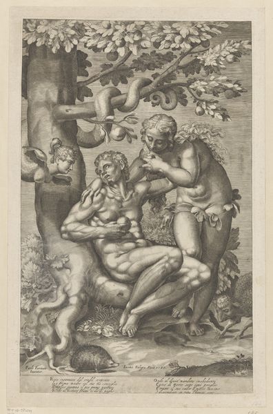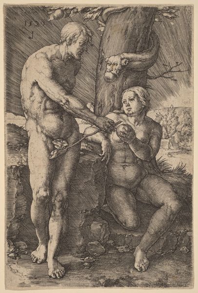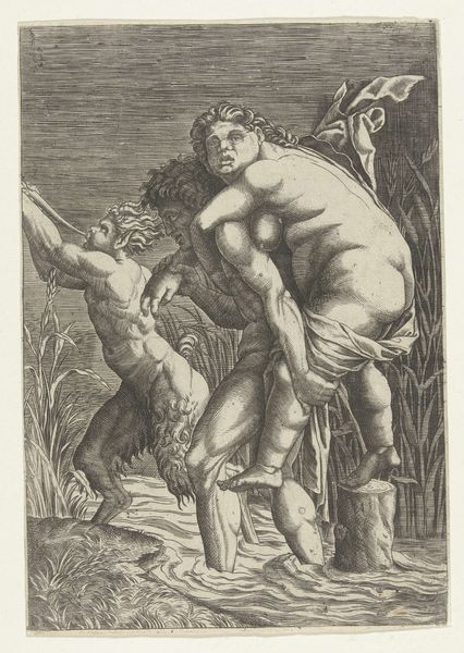 Curator: This engraving, "Mars and Venus with Cupid," made between 1500 and 1520, presumably in Italy, uses the printmaking technique to depict a classical scene. What stands out to you about it? Editor: The crispness of the lines is striking. For a work so old, the level of detail is pretty high. It's incredible that all those lines were engraved by hand! How do you see the material choices influencing the artwork's reception? Curator: Well, the choice of engraving as a medium, particularly during the Italian Renaissance, is significant. Printmaking democratized image production, making art accessible to a wider audience beyond the elite who could afford paintings. Editor: So, you’re saying that printmaking, a more affordable technique, played a role in shaping cultural values? Curator: Absolutely! The lines created by the engraver weren’t just aesthetic decisions. Each mark involved physical labor, transforming the traditional view of artists as solely "thinkers" to makers involved in production. Editor: Interesting. Looking at the scene depicted, would it be considered mass-produced erotica in some sense? The depiction of the nude Venus is clearly meant for consumption. Curator: You’ve hit on something important there! It’s not just about mythology; it’s about desire, access, and the marketplace. This also brings up the social status of craft during the period. Editor: I see. I didn't initially consider that it brings up topics that can be related to material conditions and economic systems of that period. Curator: Exactly. So, when you see art like this, consider the material conditions that made it possible, and what it says about who had access to beauty, knowledge, and representation. Editor: Thanks! Thinking about how accessible images became, shifts my perspective entirely. Curator: Mine, too. There's always more to the process!