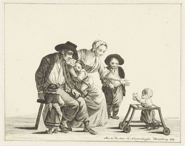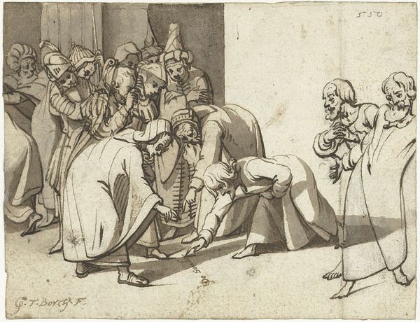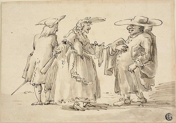Stefano della Bella created this etching, "Meeting of Dwarves," using metal, acid, and ink. The controlled corrosion of the metal plate is what gives this print its distinctive look. Della Bella would have drawn his design into a waxy ground, then submerged the plate in acid. The longer it soaked, the deeper the lines. This demanded great skill. The resulting matrix was then inked and pressed onto paper, leaving us with the image we see. Looking closely, notice how the varying depths of the etched lines create a sense of volume and shadow. The artist masterfully uses cross-hatching to build up darker tones, giving the figures weight and presence. The line becomes more than just a boundary; it’s a tool for sculpting form and capturing light. Think about the labour involved in this meticulous process and the social context of printmaking. Etchings like this were relatively affordable, making art accessible to a wider audience than paintings or sculptures. The print becomes a medium for social commentary, documenting and perhaps even poking fun at the society of its time. Appreciating the material process allows us to consider how the hierarchies of "fine art" and "craft" play out in this fascinating image.