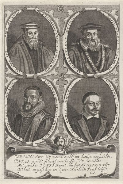 Editor: This is a print from 1764, "Portretten van Otto van Veen, Adam van Noort en Marcus Gheeraerts II", by Jan l' Admiral, done in etching and engraving. It's quite the ensemble of portraits, isn't it? What I find immediately interesting is how each portrait seems to exist on a different plane. It's like a collage of faces. How do you read the overall composition, particularly with the varying styles and framing devices used? Curator: Ah, yes, the overlapping! The artist seems to play with levels of representation. Imagine these masters frozen mid-conversation, their personalities colliding across time and artistic space! To me, it almost feels like a family photo gone surreal – uncles and aunts peering out from behind faded snapshots. Don't you find something gently absurd in their staged proximity? Editor: Absurd in a delightful way, perhaps? The layering definitely adds a quirky, unexpected dimension to what could have been a straightforward commemorative piece. Is there anything else about the artistic or cultural context that influences your interpretation? Curator: The choice of etching and engraving adds a lovely texture, doesn't it? A web of lines like captured thoughts about these great men! And given its time of creation, imagine how these men would have been viewed – not just as artists but cultural heroes. Do you think that elevation plays a part in how Admiral decided to compose this homage? Editor: Absolutely, it frames the piece with reverence. And the way each portrait seems to almost 'pop out' emphasizes the lasting impact of each artist's legacy, maybe? It really does feel like they are frozen mid-thought. Curator: Beautifully put! And notice the slightly cartoonish rendering of the figure in the background of the top portrait; what might have inspired such choices in this image celebrating masters of the craft? This tension between reality and representation invites contemplation not only about these men but art making itself. Editor: That tension you pointed out truly gives it depth! I came in thinking straightforward portraits, and I'm leaving with a meditation on art history itself. Thanks! Curator: Indeed! And that, my friend, is the delicious power of art: it asks questions, it rarely gives straight answers, but it certainly does stick around!