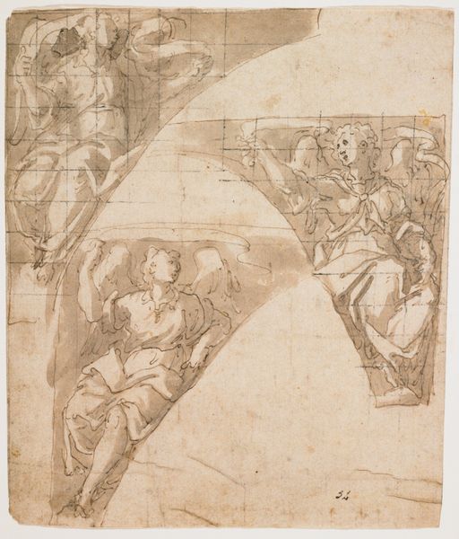 Curator: Here we have a work titled "Ontwerp voor een portret omrand door een slang," which translates to "Design for a Portrait Surrounded by a Snake." This drawing comes to us from the Baroque period, created between 1629 and 1690 by Charles Le Brun. Editor: Wow, a snake, eh? At first glance, I feel this dreamy vibe, a bit classical, with all those floating figures... it reminds me of cherubs mixed with some mathematical precision because it is a drawing in ink and pen, right? It has a feeling that you want to grab it out of its original context and animate it as a cool modern title sequence. Curator: You picked up on that tension perfectly! It's indeed a design—an "ontwerp"— so it captures Le Brun's planning and intellectual rigor. These preliminary sketches offered artists a crucial way to communicate their intention for later painted portraits in the Baroque era. Editor: I see the cherubic forms, but also, the women... one holding calipers and a tablet! What's she up to? Building a house of knowledge or something? She means business! I get a "knowledge is power" kind of feeling. Curator: Precisely! While the central figure is, well, rather hard to make out, she is being framed, designed, quite literally, within a matrix of history. Le Brun became, due to historical circumstance, the most important single artist in France and, thereby, an agent of state propaganda. Editor: Hmmm, that contextual dimension certainly paints the piece in a new light, from mathematics and science into art being constructed in society... almost politically. It now reminds me of something…the Ouroboros—that snake eating its own tail which symbolizes an infinite cycle and perpetual return! I have always wanted to ink one of those things! Curator: That cyclical element chimes perfectly! Perhaps here Le Brun suggests a constant renewal through imagery, perpetually circling back, influencing and reinventing itself over time, from concept to form. It seems to still provoke conversation in the Rijksmuseum! Editor: So cool how a seemingly simple drawing unlocks so much history, culture, personal symbolism... This drawing is an invitation into so many rabbit holes; who wouldn't get inspiration and power from such beautiful line work?!