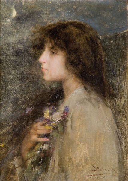 Curator: Here we have "The Flower Seller" by Charles Hermans, a painting in oil on canvas. The date of its creation, however, remains unknown to us. Editor: The overall tone feels somber, almost melancholic. It's a still-life infused with a portrait, but somehow it departs from traditional celebration and enters a pensive domain. The bouquet dominates everything. Curator: Yes, look closely and consider the societal role of flower sellers, typically working-class women, often migrants or from marginalized communities. Hermans, known for his social realism, may be critiquing the exploitation inherent in such labor. We have to remember class was deeply gendered in the late nineteenth century. Editor: I appreciate your perspective. But can we also consider the arrangement of the flowers, and Hermans' use of color theory, particularly in creating texture. Look at the rough surface around her profile; he appears less interested in depicting her as an individual and more focused on a kind of artful balance in the painting. Curator: But even the imbalance serves the narrative. Is the artist consciously commenting on the fact that so much weighs upon this anonymous woman’s shoulders? That's what it feels like she’s carrying—a lot more than roses. The burden is visible. It affects everything! Editor: I concede to your point that this may signify additional pressures upon the subject. But look at the flowers and the woman; she appears secondary. She has been intentionally painted to blend in with the background—all browns and olives, in contrast to the vivacious hues of the roses and violets and other blossoms. Curator: Perhaps, yet blending with the background isn’t simply an act of compositional arrangement—rather, to have no distinction as a person is a privilege for the few. Let us observe from which perspective she has been painted: a muted being blending into the drab colors surrounding the true focal point: Her wares, not her story. Editor: Regardless of our differences in interpretation, there is certainly room for a great many more discussions about this wonderful oil on canvas. Curator: Exactly! It invites so many critical discussions about visibility, labour, and representation.