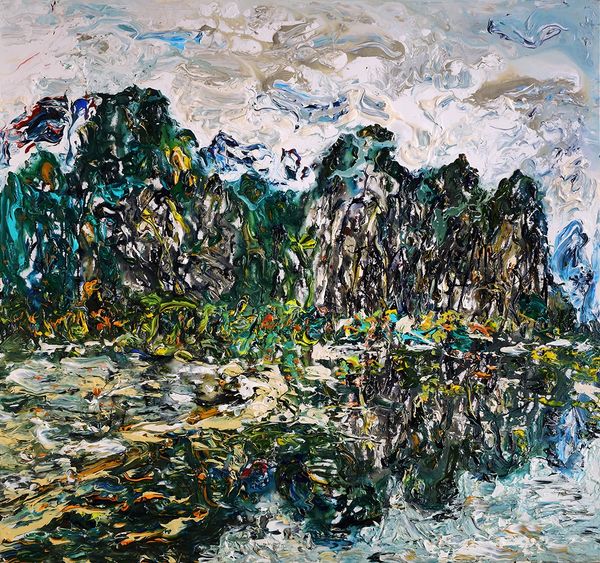Editor: Here we have Emil Nolde’s “Steaming Boats” from 1910, rendered in oil paint. I'm immediately struck by the thick impasto and the turbulent energy conveyed by the brushstrokes. It’s almost overwhelming. What do you see in this piece? Curator: I observe a dynamic interplay between colour and form, prioritizing the internal language of the painting itself. Note the way Nolde employs contrasting hues – the deep blues and greens against the vibrant yellows – to create a sense of visual tension. Editor: I definitely see that contrast, it's almost jarring. The brushstrokes seem almost haphazard at first glance, but there’s an underlying structure, right? Curator: Precisely. Consider how the diagonal arrangement of these strokes creates a sense of movement, guiding the eye through the composition. Also, think of how the materiality contributes meaning; the palpable thickness invites you to really notice his use of oil. Editor: So, rather than focusing on what the boats represent, we should focus on how the artist represents them through the pure visual language of the medium? Curator: Indeed. The subject is secondary to the expressive power of the brushwork, the formal qualities take precedence, allowing Nolde to convey an emotional intensity that transcends mere representation. Notice the layering technique, the impasto, and the vibrant colors. Editor: That's helpful. Looking at it that way, it’s much more about the experience of the storm, of the chaos, rather than a literal depiction of boats. Curator: Exactly. The painting functions as an object for contemplation, not as a window onto reality. Its essence is found within its surface, in the pure language of form. Editor: This has been a very different and clarifying perspective, shifting my attention to what is right in front of me. Curator: It's been enriching for me to focus strictly on how we interpret the pure, abstract elements within Nolde’s composition and recognize the potency of its execution.