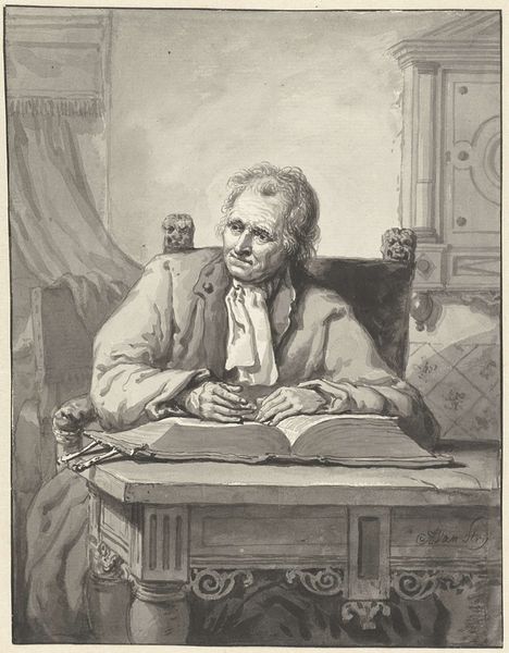 Curator: A sense of quiet contemplation just washes over me. It's melancholic, isn’t it? Almost theatrical with that dark background. Editor: You’re looking at Goya’s 1798 portrait of "Gaspar Melchor de Jovellanos" currently housed in the Museo del Prado. The oil painting portrays a key figure of the Spanish Enlightenment. A Neoclassical work infused with the burgeoning Romantic spirit, wouldn't you agree? Curator: Absolutely. The trappings of the era are all here, the refined attire, the desk laden with documents, but his expression speaks of something deeper. That faraway gaze, almost yearning. It pulls us away from the purely political. What do you think the statue symbolizes? Editor: Interesting you point that out. This depiction serves as more than a mere likeness. It embodies Jovellanos's dedication to justice and civic virtue. He was, after all, a staunch reformer. The statue would signify the virtues he fought to protect. Minerva, I believe, goddess of wisdom. A commentary on Jovellanos’ own fight and perhaps its ultimate cost? Curator: It gives a more nuanced reading. His face projects weariness but resolve as well. He holds a paper, suggesting active engagement, yet the overall mood is one of introspection. Is he burdened by the task? By the weight of his convictions? And the way Goya lights his face against the inky backdrop intensifies the drama. Editor: I think you’ve touched on an essential tension in Goya’s work of this period: portraying an individual while hinting at the complex social and political environment around him. Goya's sympathies clearly lie with Jovellanos, showing the weight carried by reformers during politically turbulent times. And we must consider Goya's own political leanings as well, his relationships to power. This could be read as an endorsement, or even a subtle critique of the burden of leadership. Curator: So it becomes a complex visual metaphor. That melancholic tone speaks volumes about the climate of the late 18th century. Very thought-provoking. Editor: It does encourage one to ponder the intricacies of power, conviction, and representation in a historical light. And as such it serves as a striking piece of historical memory, even now.