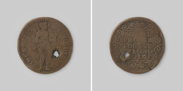Curator: So, here we have a coin—Filips III van Croy, hertog van Aarschot, prins van Chimay, dating back to 1567. It’s a metal piece, pretty small, really a tangible link to the past. Editor: My first thought? Humble. In spite of the fancy title, the raw metal with its slightly irregular shape really makes history feel less... polished. More like something you could find in your grandpa’s drawer. Curator: The "portrait" is interesting, right? Considering it’s stamped into metal rather than painted. It reminds us how value and image were intertwined back then. Power, status, quite literally impressed. Editor: Right, and it does look…impressed upon. Like an almost brutal declaration. But I wonder about the wear, and the hole in the middle? Was this just a form of currency, or something more? An amulet? A memento? Curator: A bit of both, I suspect. Money always carries a little extra weight, doesn’t it? Officially, this coin would’ve been used for trade, transactions. But for the individual holding it, it represented a fraction of the Duke’s power, a connection to their world. And damage…well, that's just history leaving its fingerprints, or in this case, thumbprints! Editor: You put it beautifully. Those imperfections make it real. To look at the incised heraldry, consider the economic impact in 1567, and then think about who clutched this coin...it transcends just metal and becomes a narrative. A tiny stage. Curator: Absolutely. It shrinks the distance. When we look closely at a humble coin and wonder what hands it passed through we aren't that separate from history at all. Editor: It becomes a dialogue.