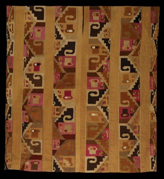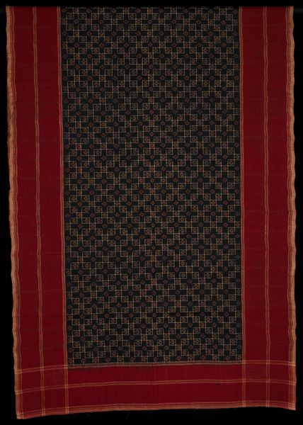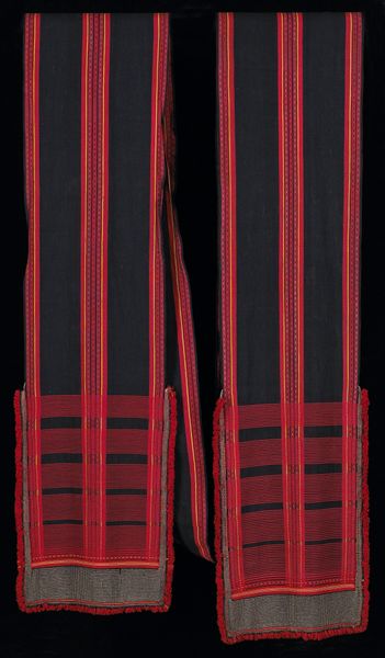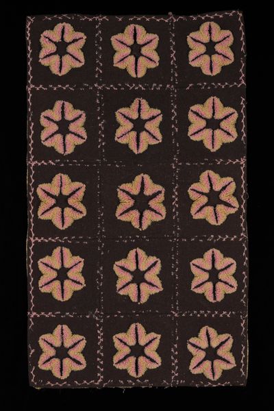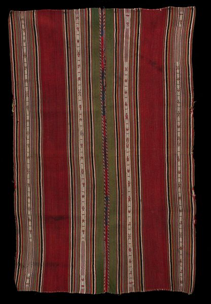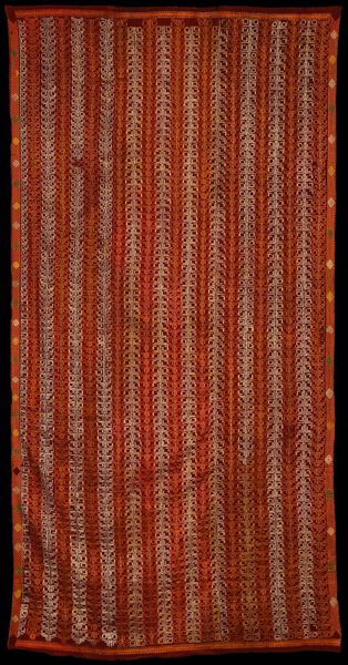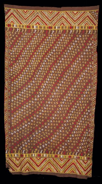 This Panel, whose creator remains anonymous, presents a fascinating study in textile design. Visually, you're immediately drawn to the interplay of geometric patterns. The expanse of crimson diamonds creates a textured field, punctuated by the structured austerity of the dark vertical bands. These bands are detailed with a delicate chain of smaller diamonds. The upper and lower registers burst with horizontal lines of multicolored embroidery. The composition isn't merely decorative; it seems to engage with a deeper structural language. The piece juxtaposes the organic with the geometric. The dominant diamond pattern, when viewed through a semiotic lens, speaks to themes of connection. The contrasting dark bands disrupt this, introducing a dialogue between order and interruption. This contrast invites contemplation on the nature of visual harmony and discord. Consider how the artist’s choice to frame the central diamond field with these linear elements affects our perception. This panel functions as more than just fabric; it's a visual discourse, inviting us to decode its intricate layers and cultural significance.