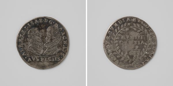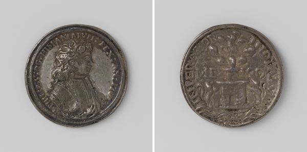 Curator: At first glance, it seems like an exercise in symbolic heraldry rendered in a Baroque style—perhaps even verging into decorative art due to the meticulous detail. Editor: We're looking at a "Nijmeegse daalder," or Dutch Thaler, from 1689. It's a silver coin, so the medium itself speaks volumes about value, exchange, and the material culture of the time. Its relief features imagery of military might. Curator: The way the figures and emblems are arranged creates an interesting tension. The soldier stands with a very prominent sword. Is it supposed to symbolize protection? Editor: Exactly! A standing, armed figure beside a heraldic shield sends a message of political power and civic defense that circulated widely among the population during this era. Coinage was a very powerful form of political communication. Consider, too, the minting process—the labour and resources involved speak to the economic infrastructure needed for such production. Curator: The inscription ringing the edge seems deliberately spaced to emphasize a sense of ordered authority and visual containment. A lion rampant on either side is like visual bookends of the city's might. Editor: Think, too, about the specific alloys mixed to give it the reflective qualities that helped it retain visual value. The production of coins often relied on exploiting newly conquered lands for materials. So even its reflective materiality speaks of colonialism. Curator: Fascinating—I’m keen to note the details like the feathered helmet and intricately rendered garments. A signifier of wealth is clearly visible and designed to reinforce the coin's implicit statement of affluence and political strength. Editor: It's really amazing to see the relationship between something small, that fits in the palm of your hand and how it ties back into an economic system which can be felt all over the globe. It brings into focus a time when commodities held real material weight, rather than the abstraction of modern finance. Curator: Indeed, this deep dive gives us both new eyes to behold this Baroque specimen as more than a piece of shiny metal, as something laden with socio-political discourse. Editor: Agreed. By recognizing how it works we're really acknowledging all the hidden labour and processes necessary to produce art and trade in Nijmegen centuries ago.