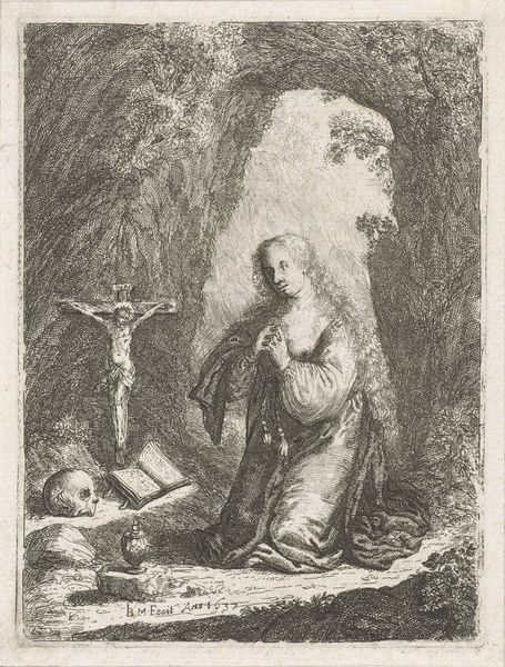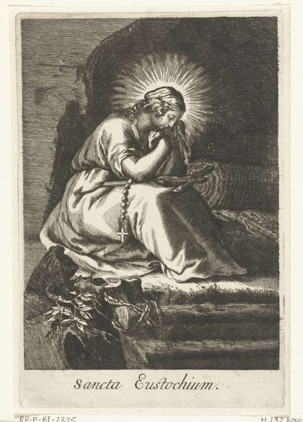 This engraving depicts Saint Marina of Alexandria as a hermit, its maker is unfortunately unknown to us. Marina’s halo, like a sun, immediately identifies her sacred status. Note the skull and crucifix, emblems of mortality and salvation, recurring symbols in the memento mori tradition. Marina’s gesture of placing her hand to her chest, her gaze turned upwards, is particularly striking. This gesture speaks to a deep introspection and piety, echoing across centuries in images of penitent saints. Think of Mary Magdalene, often depicted with a similar emotive pose, connecting intense emotion to a divine encounter. Such emotional displays engage us on a visceral level, reminding us of our shared humanity and spiritual yearning. The skull, juxtaposed with the saint’s radiant halo, presents a potent visual paradox. This tension between life and death, earthly and divine, highlights the psychological drama inherent in religious devotion. It is a dialogue that continues to resonate, proving the cyclical nature of symbols.