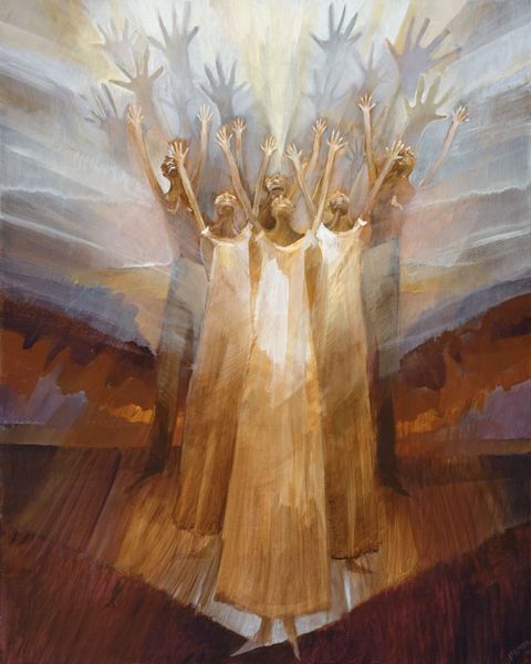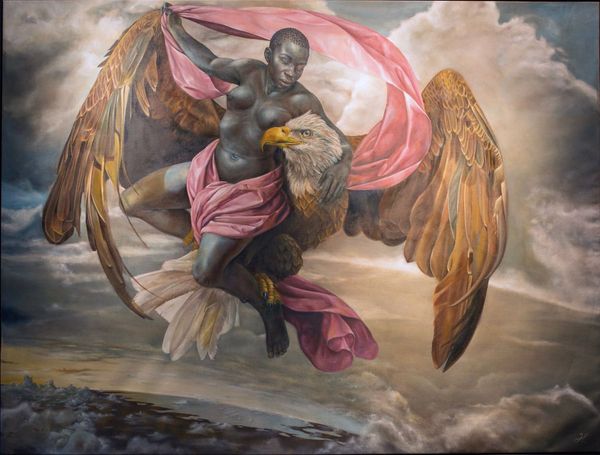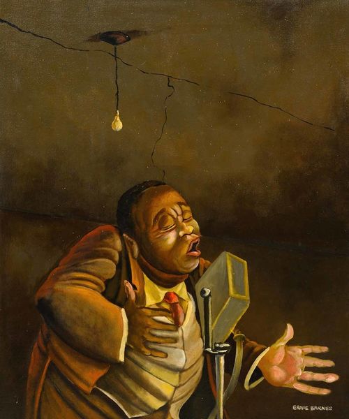Editor: We are looking at Ernie Barnes’ 1972 oil on canvas titled "The Pulpiteer." The figure's outstretched arms and tilted head immediately create a sense of passionate expression. What strikes you first when you examine its formal qualities? Curator: Immediately, the vortex in the background pulls the eye, emphasizing the preacher’s dynamism. The swirling composition clashes intentionally with the grounded color palette: browns, creams, blacks, resulting in dynamic contrast. Observe also the treatment of light—how Barnes sculpts form through highlighting key areas while obscuring others in shadow. The artist is clearly drawing attention to specific areas of interest using strategic manipulation of form and color. Editor: I see that. What is the purpose behind it? Curator: The slightly elongated limbs are notable, a hallmark of Barnes’ style, contributing to the sense of upward movement and emotional release. What we might read as a literal depiction also serves to visually amplify the emotional intensity. Do you notice the textural brushstrokes versus smooth blending to define areas such as the suit or the face? These decisions help draw the eye. Editor: That's fascinating. I hadn't considered how those subtle textural shifts affect the composition. The color palette feels somber compared to his other works. Curator: Exactly, but if you remove that swirl in the background and think of where that would lead our reading of this work, where the brush strokes would lead us, what then? The composition guides the viewers interpretation. It creates focal point. The figure almost fades into the environment. Editor: That makes so much sense now, thinking about it solely in terms of form and visual language!