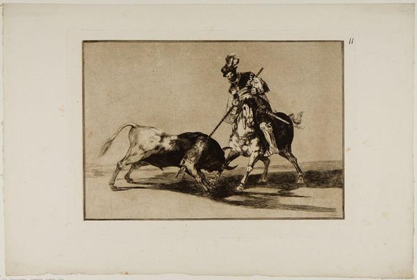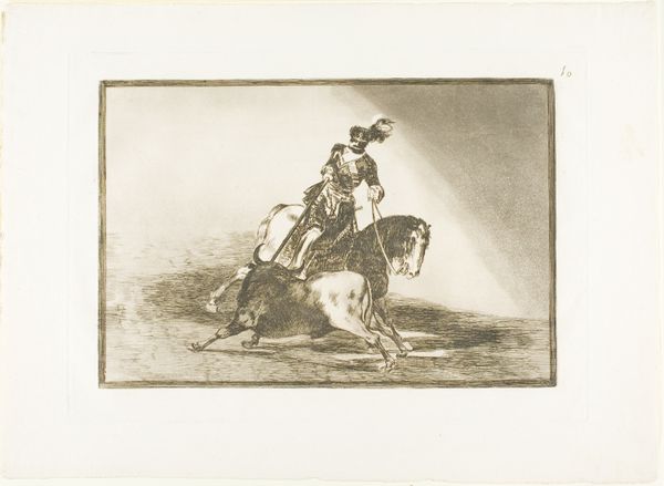 Editor: This print, "A Spanish Knight Kills the Bull After Having Lost the Horse" by Francisco José de Goya y Lucientes, is intense. What emotional narratives do you see unfolding here? Curator: The figure of the knight, still enacting his ritual even after losing his horse, speaks volumes. Notice how Goya uses the visual language of bullfighting, which itself is steeped in symbolism? Editor: It’s like a dance with death, but off-kilter. What does it mean when the expected order is disrupted? Curator: Exactly. The knight's determination, set against the fallen horse, reveals a primal battle, reflecting themes of mortality and the human spirit's persistence. The symbols resonate across time. Editor: So, it’s about more than just a bullfight; it's a meditation on perseverance. Curator: Precisely! And Goya challenges us to confront what we inherit and how we react when traditions crumble. Editor: That gives me a lot to consider. Thanks! Curator: My pleasure. I hope it sparks new ideas!