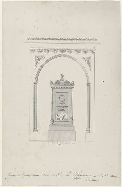 Editor: This delicate drawing by Karl Ballenberger, titled "Säule an dem rechten Altmühl Ufer an der Strasse nach Oettingen nächst der Brücke zu Gunzenhausen," showcases a column rendered in ink. It feels quite precise, almost like an architectural blueprint. What stands out to you about it? Curator: It whispers secrets of a time when observation was a slower, more deliberate act. I see not just a column, but a reverence for detail, a mindful attempt to capture not just the *what*, but the *how* of existence. The lines aren't just lines, they are breaths held and released. Editor: So, you see beyond the literal depiction? Curator: Exactly. It's like Ballenberger is inviting us into his own act of seeing, forcing us to consider the artistry inherent in structural design. He is offering us a way into his mind and this landscape; a meditative stroll through geometry. This isn’t just technical drawing; it's a poetic inquiry. Editor: I didn't think about the artist’s experience of drawing this piece. Are the geometric forms symbolic? Curator: I'd wager they're less symbolic and more about proportion, perhaps about some philosophical pursuit of perfect ratios and universal forms. The column is a marker, sure, but also a quiet declaration of order amidst the glorious, chaotic landscape that must have surrounded it. Editor: It really makes me want to visit that place now! Curator: Exactly! The artist has transported you. Editor: I never thought a technical drawing could be so evocative! Thanks, this really expanded my understanding.