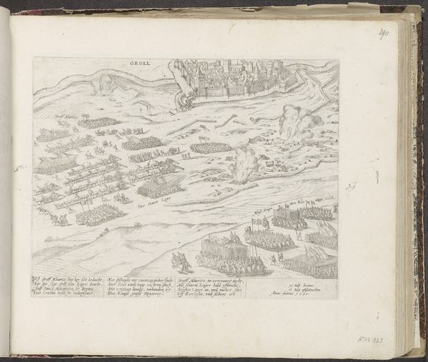 This is Frans Hogenberg's etching "Beschieting van Königswinter, 1583," created circa 1583. The composition immediately draws the eye across the landscape, structured by a prominent river that divides the space. The densely packed figures, rendered with fine lines, create a textured foreground in stark contrast to the smoother, sloping hills. Note how Hogenberg uses line and perspective to structure not just the physical space, but also the implied narrative of conflict. The town perches atop the hill, rendered almost as a theatrical backdrop. Hogenberg’s structuring of space and events reflects a broader shift toward visual storytelling in the 16th century. The image is not just a depiction of war; it's a carefully constructed representation of power dynamics and historical narrative. It invites us to consider how space and action, through form, can shape our understanding of history itself.