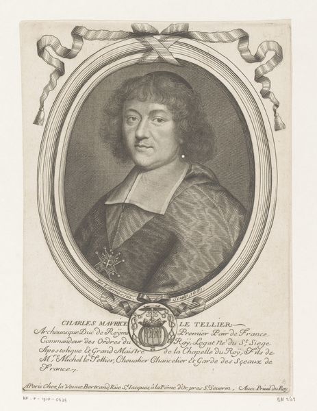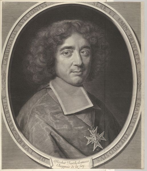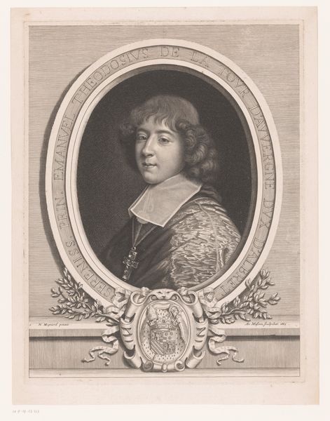 Robert Nanteuil’s portrait of Emmanuel-Théodose de La Tour d'Auvergne, the Cardinal de Bouillon, is an engraving that captures the essence of its subject through meticulous lines and structured composition. The oval frame, with its surrounding inscription, immediately draws our eyes to the Cardinal's composed figure. Nanteuil's technique employs hatching and cross-hatching to sculpt the face and drapery, creating a sense of depth and texture. The carefully rendered details like the curls of the hair, and the ornate cross hanging from his neck, offer a glimpse into the Cardinal's status. Below, an elaborate crest mounted upon what appears to be a mantel, completes the work. Nanteuil’s precise engraving technique reflects the 17th-century interest in clarity and order, resonating with broader philosophical concerns about representation and identity. The portrait, through its formal structure, communicates power and intellect, inviting us to consider how appearances can be constructed and interpreted.