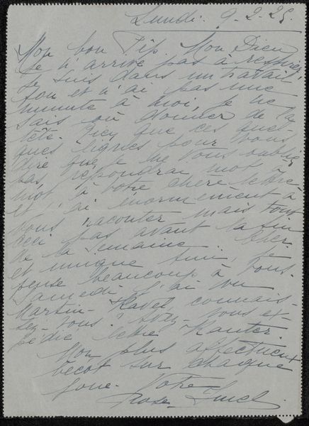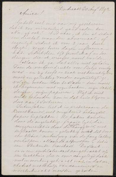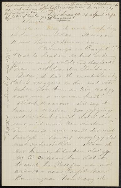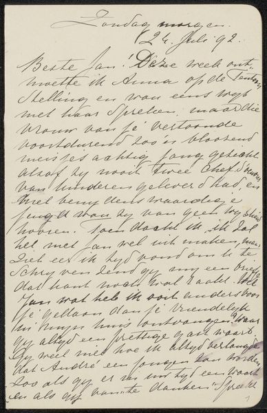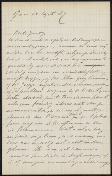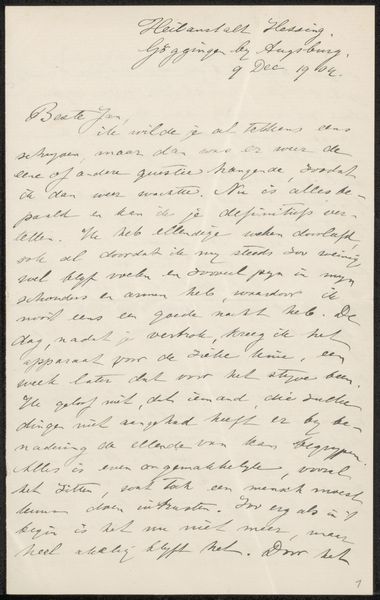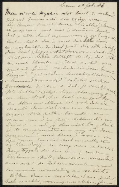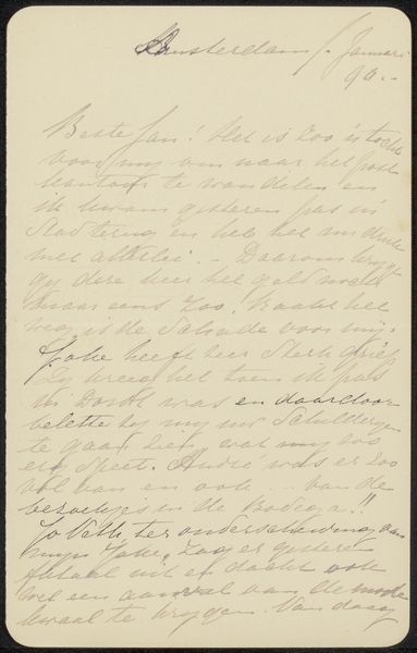 Editor: This intriguing piece, “Brief aan Jan Veth,” possibly from 1886, uses ink on paper. The script, while artistic, is difficult to read. What emotional or cultural significance do you find conveyed through this form of intimate correspondence? Curator: I see the power of the handwritten word, the personal touch, carrying a certain weight. Calligraphy itself, beyond the literal meaning of the text, functions as a symbolic gesture of intimacy and connection. How do you think the act of writing itself contributes to the emotional power of this piece? Editor: It feels like an intentional effort toward connection and sharing. It also strikes me as a glimpse into a very specific time and relationship. Is there anything we can infer from the style of the letter itself? Curator: Consider the labour involved, compared to a telegram or even a typed letter from a later date. There's a ritualistic aspect. Each carefully formed character represents a conscious effort to communicate not just information, but also care and attentiveness. This speaks to the perceived value of personal connection at that time. What emotional layers do you feel this adds for a modern viewer? Editor: Knowing how quickly we communicate today, it almost feels like a lost form of connection – a reminder of a time when slowing down and really investing in your communication was the norm. Thank you, this has provided a richer understanding of this particular letter. Curator: Indeed. Seeing it as an intimate message, preserved as an artifact, highlights the lasting power of visual and textual symbols to communicate beyond their immediate purpose.