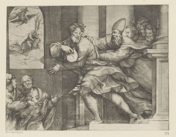 Editor: So, this engraving, "Tobias and the Archangel Raphael, from The Story of Tobias," created in 1543 by Georg Pencz, has a very clear, staged feel. I’m struck by the intense expressions, like they’re performing a play. What historical context can illuminate this piece? Curator: The staged quality you're noticing connects to the performative aspects of religious life during the Reformation. Pencz, as a printmaker in Nuremberg, was deeply embedded in a city grappling with shifting religious authority. This image is less about pure faith, perhaps, and more about visualizing religious narrative for public consumption. Does the setting seem significant to you? Editor: Definitely! The figures are set in a domestic interior but positioned in front of an important architectural component of the stage. But the space seems… small, compressed. Curator: Exactly. That cramped feeling is important. Pencz is working within a tradition of Northern Renaissance art, where detailed interior spaces often serve as sites for moral dramas. The setting, even if idealized, brings the divine story into a relatable, human context. Who do you think this was made for, and how might it have been used? Editor: Maybe this print was used in homes, perhaps to help illustrate the biblical narrative for a family's daily worship or lessons? Something personal and instructional? Curator: Precisely. Prints like these served a crucial role in disseminating religious stories, especially in a time of increased literacy. Pencz's work demonstrates the power of imagery to shape religious understanding and the politics embedded in interpreting such stories. It also shows that art always participates in public conversation. Editor: I never considered how prints like this were essentially mass media of their time! I'll definitely look at art differently now, thinking about its role in shaping public opinion and the powers at play. Curator: Excellent. Remember, art is not created in a vacuum, it exists in continuous conversation within its social milieu, mirroring and shaping that very society, even now.