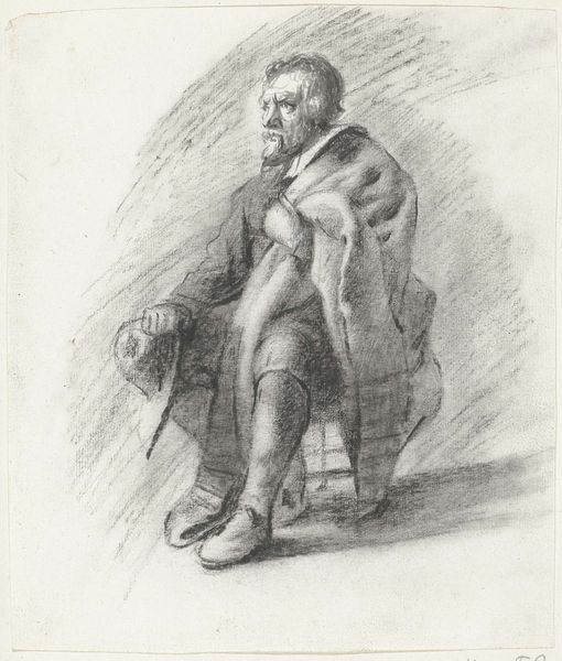 Editor: Here we have Muirhead Bone’s “Joseph Conrad Listening to Music,” made between 1923 and 1925. It’s an engraving, giving it this incredibly delicate, almost ephemeral quality. I'm really struck by how pensive and weary Conrad appears. What are your initial thoughts on this piece? Curator: It's fascinating to see Conrad, the great novelist of the sea, depicted not in action or adventure, but in quiet contemplation. The title directs us, specifically, to his act of ‘listening’, perhaps inviting us to consider the role of sound and its representation. In the 1920s, portraiture wasn't simply about capturing likeness. It was often deployed as a marker of cultural significance. Think about it: who gets their portrait made, and why? Editor: So you're suggesting the very act of commissioning Bone to create this print elevates Conrad’s status? Curator: Precisely. Furthermore, prints, unlike unique paintings, are designed for dissemination. This speaks to the public role of the artist and the deliberate attempt to cement Conrad’s image in the cultural landscape. Consider also the style: The emphasis on line, rather than tone, moves this away from idealized or flattering portraits toward a modern depiction rooted in realism and perhaps even fragility. What do you notice about Bone's linework? Editor: It’s economical, for sure. He uses just enough lines to suggest form, especially in Conrad’s face. You see the weight of experience there. Curator: And that careful editing is key. By stripping away excess detail, Bone focuses our attention on the psychological interiority of Conrad. The print asks us to consider Conrad as a thoughtful, complex figure deeply connected to the socio-political shifts of his time. It highlights a public image carefully curated through art. Editor: That's fascinating. I had considered it just a portrait, but you've shown how it participates in building and broadcasting Conrad’s public image. Thanks! Curator: It’s a great example of how even seemingly simple portraits can tell complex stories about culture, status, and artistic intention.