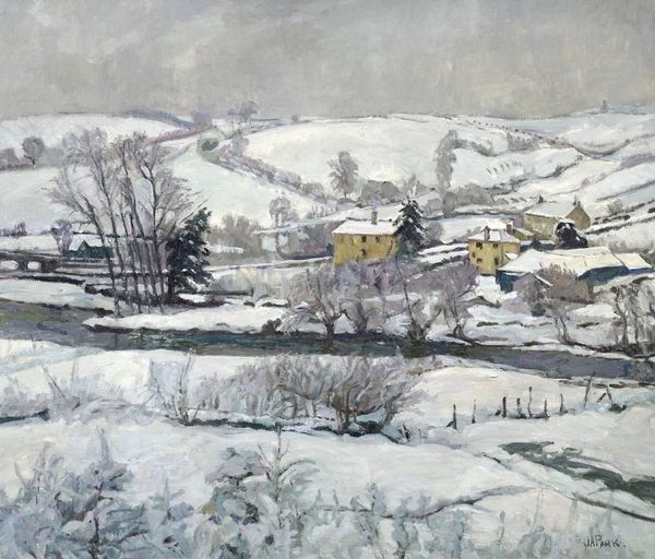 Editor: Here we have Clarence Gagnon’s “Mill and Stream, Morning Sun” from 1913. The use of, what I assume are, oils to depict the harshness and stark beauty of a Canadian winter. The way the sunlight illuminates that little yellow house is just gorgeous, but there's also something slightly melancholic about the whole scene, don't you think? What draws your eye when you look at it? Curator: Melancholic, yes, like a whispered memory. What seizes me is how Gagnon uses light - not just to illuminate, but almost as a character in the drama. See how the cold, bluish shadows define the snow, and then how that sunrise *kisses* the house, bathing it in a warmth that’s both inviting and fleeting? It’s like that golden hour when the world holds its breath. Does it make you wonder about who might be inside, stirring to life in that humble abode? Editor: It does. And the shadows *are* incredibly striking, adding a lot of depth. Almost makes the scene feel... three-dimensional despite the flatness of some areas. Curator: Exactly! There's a playful tension between representation and abstraction. He’s hinting at realism, but with that bold, almost Fauvist palette and simplified forms, he invites us to *feel* the cold rather than just see it. Think about that stark contrast – the snug warmth of home against the biting vastness of the landscape. How does that dichotomy sit with you? Editor: It’s definitely thought-provoking. The comfort is almost vulnerable, set against such a powerful natural scene. Curator: Perhaps, and beauty isn't always soft or soothing; it can have an edge, a chill. And it's a reminder that even in the harshest environments, life persists, often finding warmth in the simplest of things. Editor: That’s a beautiful way to put it. I definitely appreciate the painting on a deeper level now. Thanks! Curator: My pleasure. Sometimes all we need is to tilt our heads a bit to see a familiar world anew.
