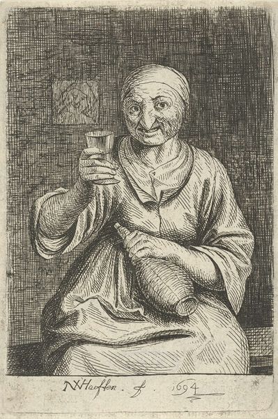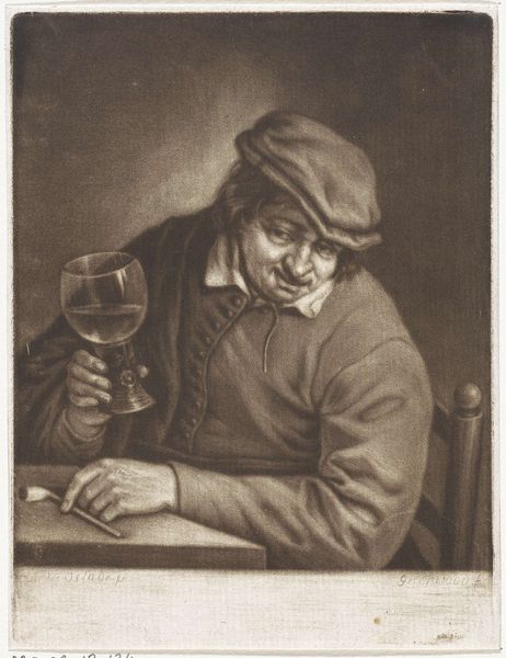 Editor: We're now looking at "Smaak," a print made by Cornelis Dusart between 1679 and 1704. It's currently held at the Rijksmuseum. The subject's exaggerated expression and the contrasting textures of his robes and the wine glass give it a unique, almost comical feel. How do you approach interpreting this work? Curator: Formally, I'm drawn to the stark contrasts and the manipulation of light and shadow to create depth and volume. Notice how Dusart employs hatching and cross-hatching techniques. It gives the piece an almost sculptural quality, wouldn't you agree? Consider, also, the dynamic composition. The figure is off-center, yet balanced by the objects on the barrel, drawing the eye through the various planes of the image. Editor: Yes, I see that. The way the light catches on the glass is particularly effective. Curator: Precisely! The glass becomes almost a focal point, contrasting with the earthy tones and textures of the figure's clothing and the wooden barrel. Observe how this visual tension contributes to the overall sense of dynamic movement. And what do you think of the negative space in the upper right corner? Editor: It feels a bit empty, but maybe it helps emphasize the figure's isolation? Curator: Perhaps. Or consider it as a compositional tool that contributes to the asymmetrical balance of the print. It allows our eye to rest, before being drawn back to the detailed rendering of the figure and still life. It prevents the image from feeling too cluttered, enabling the viewer to concentrate on the intrinsic form. Editor: I hadn't thought of it that way. Thanks, seeing the balance within asymmetry really changed my perspective. Curator: Indeed. By looking closely at form, line, texture and their relation, we unlock an avenue for aesthetic appreciation and meaningful exchange with artwork, time and time again.