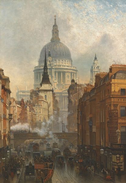 Curator: Thomas Girtin's watercolor, "St. Paul's Cathedral from St. Martin's-le-Grand," created between 1790 and 1800, presents a fascinating perspective on London's urban landscape. Editor: It’s such a captivating cityscape. The cathedral looms so large, almost as if it's a dreamlike presence rather than a building within the city. How do you interpret the social dynamics presented here? Curator: I see a layered commentary on power and visibility. Consider how Girtin positions St. Paul's – a symbol of authority – not just as a background element but almost pressing down upon the street life below. Notice the figures, their relative anonymity in the face of architectural grandeur. Editor: Yes, they're dwarfed by the architecture! So, is Girtin critiquing the dominance of institutions over everyday life? Curator: Precisely. Girtin is a Romantic era painter. Consider the historical backdrop. How might the Enlightenment's emphasis on reason be interacting with the growing anxieties about industrialization and social stratification in London at the time? Does it perhaps give visibility to those who aren't powerful? Editor: I guess the city becomes this stage where these tensions play out. Curator: Exactly. It asks us to contemplate who shapes the narrative of urban space, who is seen, and who is overlooked. What stories are being told through the brushstrokes about class, about progress, about the individual versus the collective? Editor: This really makes me think about how artists can use perspective and scale to make powerful statements about society. Thanks, this was really helpful! Curator: It was my pleasure. Exploring these intersectional narratives is vital to understanding art's relevance.