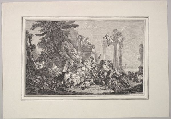 Editor: This is "Oorlog en tirannie teisteren Nederland," or "War and Tyranny Devastating the Netherlands," a 1674 etching by Romeyn de Hooghe, at the Rijksmuseum. It's… intense. The sheer chaos is overwhelming, all that fire and struggling bodies. What exactly am I looking at here? Curator: You’re looking at a carefully constructed political statement, reflecting the anxieties of a nation under pressure. De Hooghe uses allegory to comment on the Franco-Dutch War. Look at the central figure riding the lion – does it remind you of anything? Editor: It looks like… Louis XIV? But more like a god of war? Curator: Precisely! By depicting the French king in this way, De Hooghe isn't just showing a military conflict, but rather indicting Louis XIV's hubris. Consider the perspective of ordinary Dutch citizens at the time, constantly facing invasion. What symbols speak to the impact on their lives? Editor: The fallen people, the burning towns in the background... it’s less about glorious battle and more about suffering. The etching is communicating the very real social disruption. Curator: Exactly. And think about the choice of etching – a medium accessible to a wide audience. De Hooghe is deliberately disseminating a critical perspective. What kind of impact could images like these have in shaping public opinion and resistance during a war? Editor: So, this isn’t just a historical record. It’s a call to action. It humanizes the victims of war and also serves as political propaganda. I see that the figures and staging serve a precise purpose beyond being aesthetically beautiful. It’s interesting how De Hooghe situates this event within a broader commentary on power and accountability. Curator: Indeed, viewing this image invites us to question who benefits and who suffers during war and oppression, even today.