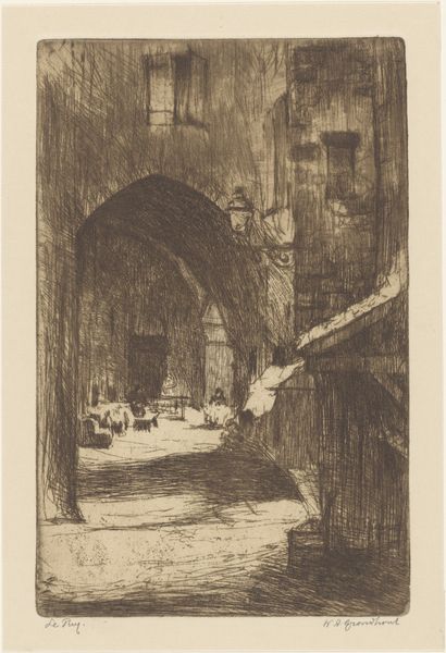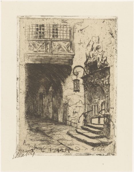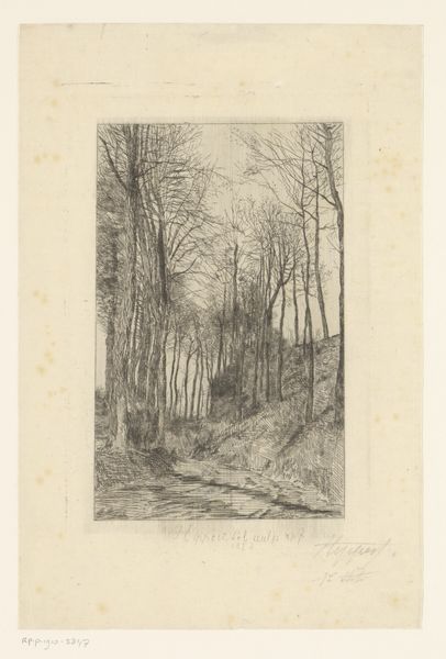 Editor: This is "Oprit van landgoed Elswout," a landscape etching by Cornelia Christina Johanna van Trigt-Hoevenaar, made sometime between 1864 and 1909. It's a very detailed scene; the light and shadows create an almost dreamlike quality. What do you see in this piece beyond the idyllic scene? Curator: I see a meditation on privilege and access. While the artwork seems to celebrate the beauty of the Elswout estate, we must consider the historical context: Who had access to such landscapes? Who was excluded? How does the image contribute to the romanticization of land ownership during a period of vast social inequality? Editor: That’s a powerful perspective. I hadn’t really thought about it that way. Does the medium, etching, play into that reading? Curator: Absolutely. Etching, as a printmaking technique, allowed for wider distribution of this image, potentially reinforcing the perceived status and desirability of such estates among a growing middle class aspiring to elite lifestyles. It visualizes a reality divorced from the working-class experiences of the time. How do you feel that changes our interpretation of its "realism"? Editor: So, it's not just about what’s depicted, but also how it was shared and consumed. It makes me wonder about the artist's intentions, too. Was she consciously aware of this dynamic? Curator: That's the key question! Unpacking those layers is where art history connects to larger conversations about power, representation, and the ongoing legacy of historical inequalities. Considering Van Trigt-Hoevenaar's position within that society, her choices, conscious or not, reflect the complex dynamics of the time. Editor: This has completely transformed my understanding of what seemed like a simple landscape print. Thank you! Curator: And thank you for bringing fresh eyes to it. That’s what makes these conversations so important – constantly re-evaluating art within the contexts that shaped it, and that it helped shape.