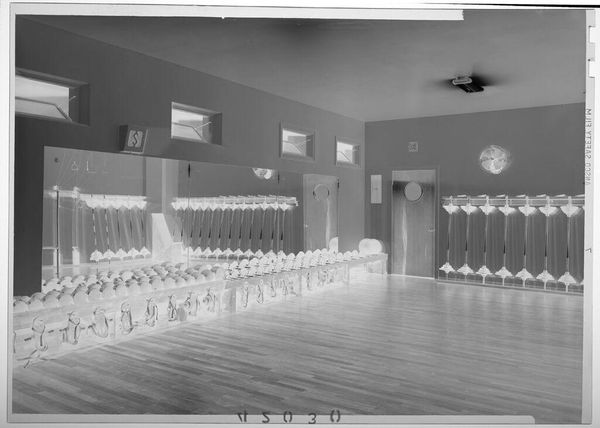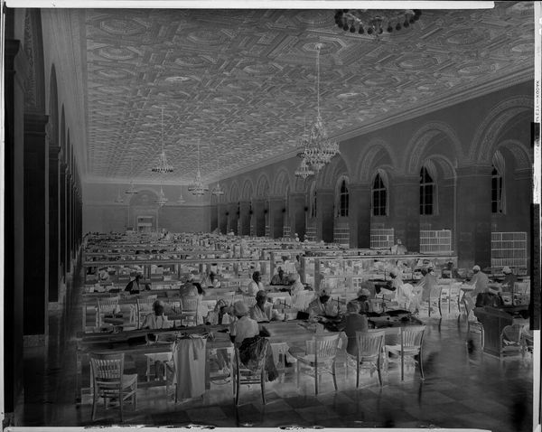 Editor: This photograph, titled "Untitled (large group of men eating and drinking at long banquet tables)" by Jack Gould, really strikes me. The sheer scale of the gathering is compelling. What draws your eye in this piece? Curator: Well, the photo's inverted tonality emphasizes the material conditions of its production. The negative image highlights the chemical processes, reminding us of photography's roots in industrial labor. The photograph immortalizes a specific type of consumption within a tightly structured social context. How does that labor impact the men? Editor: That’s an interesting point. It makes me consider the labor that went into preparing this meal, and who is missing from this image. Thanks for sharing your perspective. Curator: Likewise; thinking about the social dynamics in relation to labor and its absence has broadened my view.