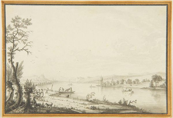 Curator: This delicate rendering is entitled "Offenbach," by Karl Ludwig Zehender. Editor: It's remarkably serene. The way the artist uses hatching makes it feel like a memory, a whisper of a place. Curator: The scene depicts leisure activities—fishing, boating—and agricultural labor, interwoven into the landscape. It's a slice of 18th-century life, distilled through Zehender's precise hand. Note the man resting under the tree, a timeless image of repose. Editor: Absolutely, and it calls to mind a collective memory. This is an image from a place that I have never been to, but I recognize this scene on a deeply personal level. Curator: The composition leads the eye gently across the scene, from the dark foreground to the soft, distant skyline. Editor: You know, it really does feel like a perfect little world, captured in ink. Curator: I agree. It's a quiet testament to a bygone era, offering a glimpse into the symbiosis of work and rest.
