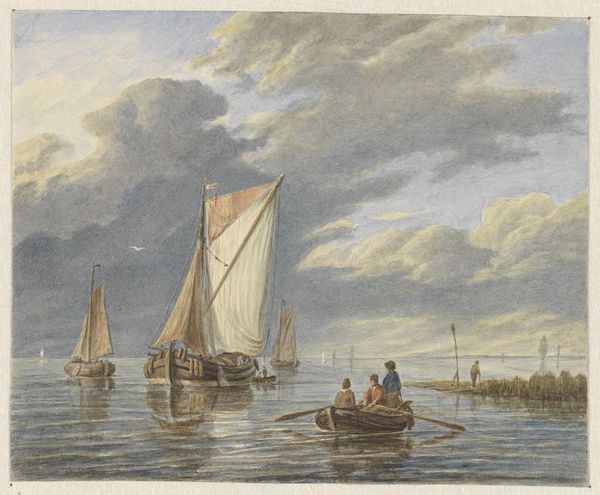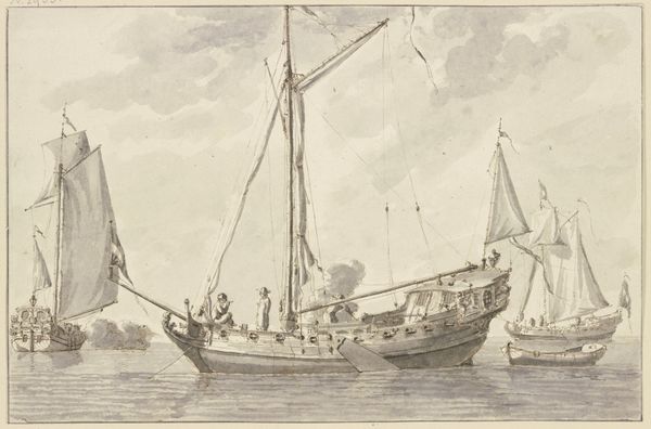 Editor: This is a watercolour and ink drawing by Nicolaas Wicart, titled "Two Ships Sailing on a Very Wide Stream, a Church on the Bank Among Trees." It feels serene, almost dreamlike, with the soft washes of color. I'm curious, looking at the details of the ships' construction, what's your perspective on this work? Curator: The materiality of this piece interests me most. The combination of ink and watercolour, particularly on paper, speaks volumes about artistic production at the time. Watercolors weren't necessarily considered "high art," more aligned with sketching or preliminary work. Look at the delicate underpainting, too. Editor: So you're saying the materials themselves challenge some established ideas? Curator: Precisely. And it prompts us to consider the social context: Who was making art like this? For whom? Was this intended for public display, or more personal consumption? What kind of labor went into the construction of these boats? Editor: That’s interesting; it’s not just the final image, but the materials and the labor behind it that tell a story. I guess I hadn’t considered how the perceived "value" of a material could affect the art itself. Curator: It certainly does! It redefines our understanding of value. By focusing on the means of production, we can unpack social hierarchies embedded within the art world itself. Editor: Thanks, I see it now! I’ll definitely pay more attention to how and why an artist chooses certain materials. It adds a whole new layer of understanding. Curator: Absolutely. The devil, as they say, is in the details... especially the material ones!