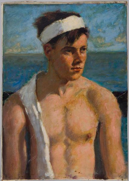 Curator: It’s amazing how much emotion Ross captures in such a small work. This is a 14 x 10 inch oil-on-canvas painting, entitled "Half-Length Portrait of a Young Man," housed here at the Harvard Art Museums. Editor: There's a pensive mood about it. The subdued palette and the averted gaze create this intimate and slightly melancholic atmosphere. Curator: The vulnerability of the subject is heightened by the historical context. Early 20th-century anxieties surrounding masculinity and identity are palpable here. Editor: True. The composition, though classical in its bust format, feels raw. The brushstrokes are visible, and the colors bleed into each other, giving it an unfinished quality that speaks to the subject's inner turmoil. Curator: It's fascinating how Ross invites us to consider the complexities and struggles inherent in the performance of gender and selfhood. Editor: Precisely. Ultimately, the formal qualities of this painting amplify its psychological depth, making it a truly compelling work.