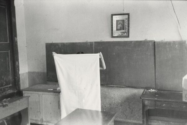 Curator: Jindrich Styrsky's gelatin silver print, simply called "Untitled," presents a rather somber, almost spectral scene. Editor: It certainly does. The stark contrast and grainy texture immediately convey a feeling of decay and isolation. Curator: Note the meticulous composition, though. The placement of the headstone, the small table—they create a visual rhythm, directing our gaze across the frame. Editor: And the German inscription on the stone, "Ruhestätte der Familie Brousil," suggests this is a family burial site, hinting at specific cultural and historical contexts related to death and remembrance. Curator: The wall behind, with its peeling paint and darkened patches, functions almost as an abstract expressionist painting within the photograph. Editor: Yes, that backdrop contributes to the overarching narrative, underscoring the passage of time and the impact of history. Curator: A fascinating interplay between form and content. Editor: Indeed, Styrsky invites us to contemplate both the visual elements and the socio-cultural implications embedded within the image.