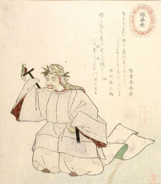 Curator: This is a woodblock print by Utagawa Kuniyoshi, titled "Man in Blue Kimono with Yellow Umbrella..." The Harvard Art Museums hold this particular impression. Editor: There's a vulnerability to this figure. His bare feet and distracted gaze, combined with the rain, suggest a kind of forced exposure. Curator: Indeed. Kuniyoshi, active during the late Edo period, often depicted kabuki actors, and this print seems to capture that theatrical intensity. His appearance, with the blue makeup, is actually part of the costume of a Kabuki actor, Ichikawa Ebizo. Editor: The umbrella, usually a symbol of protection, is furled. Instead, it almost feels like a prop, a visual cue to a story we don't fully know. Curator: The plaid kimono, while striking, also signifies a shift in fashion and perhaps even social codes during that era, moving away from traditional norms. He seems to be trying to shield himself from the downpour. Editor: It's a compelling image—the tension between the man's internal state and the external world so vividly portrayed through these visual symbols. It's as if we've caught him in a moment of profound self-reflection. Curator: Kuniyoshi's ability to capture the nuances of human emotion within a rapidly changing society is why he remains so relevant.