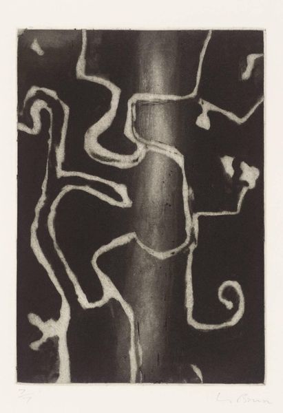 Editor: Here we have an untitled print by Christopher Le Brun, held at the Tate. The stark contrast and simple forms are quite striking. What can you tell me about this piece? Curator: Well, I'm interested in how this print challenges traditional hierarchies. The medium itself, a print, speaks to reproducibility and accessibility, differing from unique artworks. What materials were likely used? Editor: Based on the texture, probably etching or aquatint, some kind of metal plate and acid. Curator: Precisely. This brings the artist’s labor into focus. Consider how the process of acid etching on metal contrasts with, say, oil painting in its implications for labor and, ultimately, consumption. It's not just about the image, but the means of its creation. Editor: That's a perspective I hadn't considered. Thanks! Curator: My pleasure.