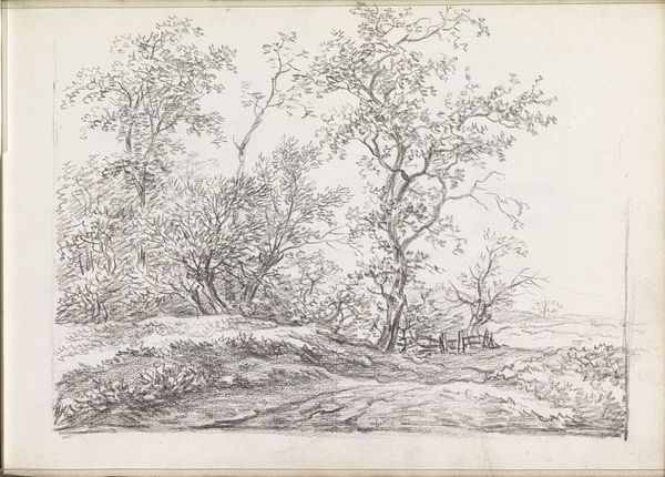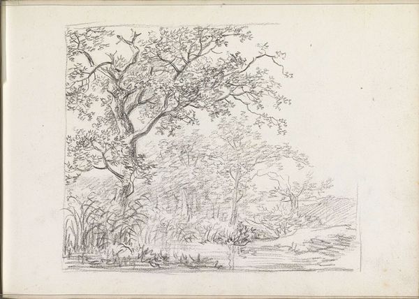 This drawing, "Brug over water" or "Bridge Over Water", was made by Andreas Schelfhout and is currently housed at the Rijksmuseum. Notice the delicate graphite lines that compose this waterside landscape, giving it a textural richness. The composition is dominated by the structural forms of trees, their branches reaching across the page, interwoven with the quiet stillness of water and a small bridge. Schelfhout masterfully uses line to create depth and form. The detailed rendering of foliage and reflections on the water's surface give us a sense of immersive space, despite the monochromatic palette. We can decode the semiotic meaning of the work through structuralism to see nature as a sign, representing tranquility and contemplation. The bridge itself serves as a visual metaphor, mediating between the human and the natural world. The drawing can be interpreted as an early 19th-century engagement with romanticism, where nature is not just a setting but a profound, emotional space. It's a reminder that art, through its formal qualities, invites us to contemplate the structures that shape our understanding of the world.