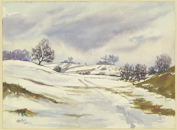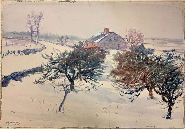 Curator: Dodge Macknight's "Winter Landscape" offers a striking perspective. The dimensions are 39.1 by 56.1 cm, and the location is the Harvard Art Museums. Editor: It feels so bleak, so cold. The purplish trees against the white snow create a very somber mood. Curator: Macknight was known for his commitment to pure color and direct painting. His use of watercolor paper, the layering of washes, all speaks to a conscious engagement with the materiality of his craft. Editor: I think the figures on the left give a sense of scale but also hint at how this landscape might have shaped winter activities or been viewed within the community. Curator: Exactly, we might consider the availability of paper, pigments, and even leisure time necessary to produce such a work, positioning it within specific historical circumstances. Editor: I find its simplicity strangely captivating. It really captures the stark beauty of winter. Curator: Agreed, and viewing it through a material lens helps appreciate the labor involved, and ultimately, the value we ascribe to this object.