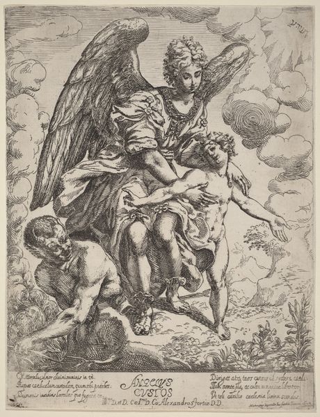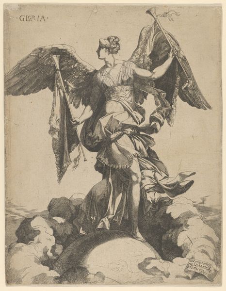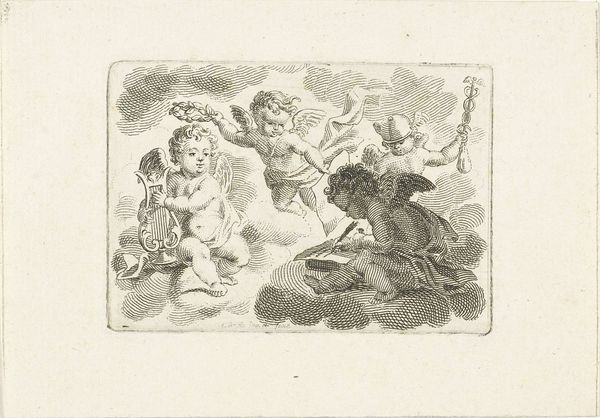 Jacob Campo Weyerman created this etching titled "Allegory on Painting," sometime in the 18th century, when the cultural landscape in the Netherlands was shaped by both the legacy of its Golden Age and emerging Enlightenment ideals. Weyerman, known for his writings on artists, uses symbolic language to elevate painting. The winged figure embodies artistic inspiration. Note how the tools of the trade—palette, brushes, and maulstick—are arranged almost as trophies. The text on the book translates to 'prison fruits', revealing Weyerman's activity as a writer during his imprisonment. Weyerman positions the artist as an almost divine figure, touched by genius, transcending the earthly realm. Consider how this image might reflect the changing status of the artist in society, from craftsman to celebrated intellectual. It invites us to contemplate the power of art.