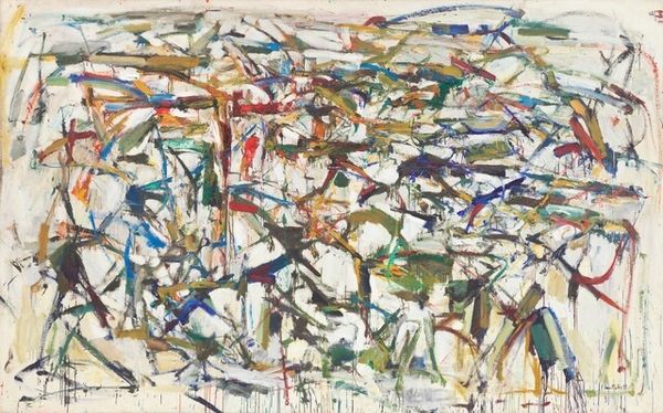 Curator: Welcome. We're looking at Joan Mitchell’s "Ladybug," painted in 1957, using acrylic on canvas. What’s your first impression? Editor: Chaos, yet strangely organized. I see dynamic, almost violent brushstrokes layered against this stark white canvas. It feels unresolved, caught in a perpetual state of becoming. Curator: Mitchell, during this period, was deeply engaged in the Abstract Expressionist movement, influenced by artists like Pollock and de Kooning, who redefined art’s social role as less mimetic and more performative. Editor: Performative, yes, absolutely! There is a performative nature present. Note the layering, building up textures but letting each colour maintain its individual intensity and impact—that expressive power speaks volumes. Curator: The title "Ladybug," while seemingly simple, creates an interesting tension, because the image doesn’t easily lend itself to obvious natural referents. One wonders about the title’s connection to Mitchell’s broader views on women and the art world at the time. Editor: Hmm, true—the abstraction feels disconnected to that sort of imagery, yet it creates an intriguing visual contrast, playing with our perception. I love how she juxtaposes lighter hues with deeper blues and reds—an intense spatial push and pull! Curator: Consider too, her position as a woman in a male-dominated art scene. Her gesture was to paint with as much force and assertion as any of her male counterparts, to make her own unique statement. Editor: Yes, that makes me think of what sounds like a defiance! She refuses to conform—or resolve completely. Her brushwork is so free—and this is an acrylic, right? It lets her work so intensely on this large canvas. It almost feels like the gestures come from the whole body, an unfurling in motion! Curator: Precisely. Understanding her social positioning helps unlock another layer of understanding. The emotional weight feels less abstract when situated in its time. Editor: Agreed. This really allows me to consider abstract art not simply as a collection of aesthetic choices, but, in a sense, the artist wrestling with their place in the world and what that place offers in response. Curator: Thank you, this piece truly showcases not only Mitchell’s artistic choices but offers much information about the cultural contexts that fostered such expression.
