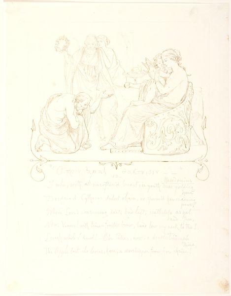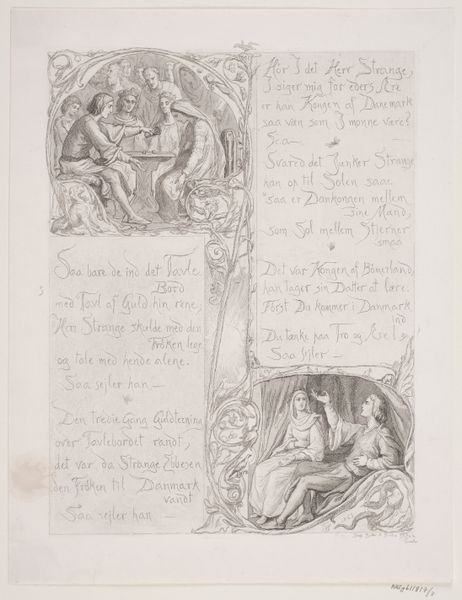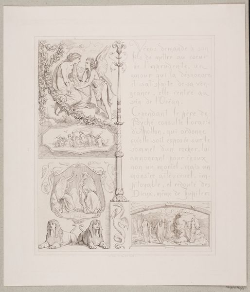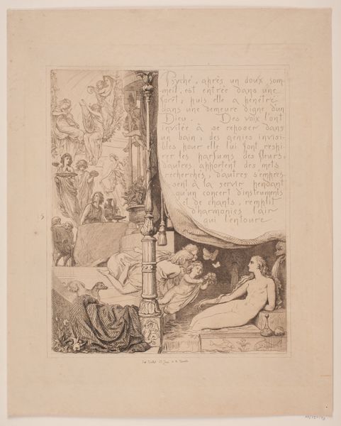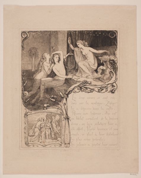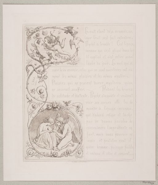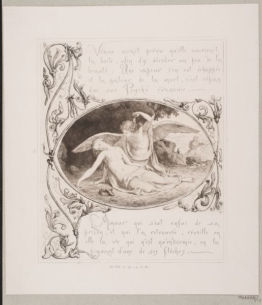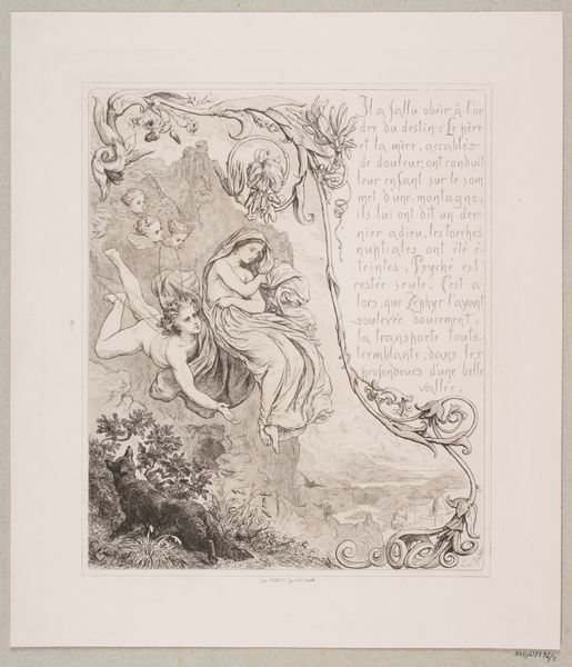 Curator: Today, we're looking at Lorenz Frølich's "Illustration nr. 17 til "L`Amour et Psyché"" from 1862, an etching and engraving printed on paper. Editor: It has a fairytale-like mood. Dark, a bit unsettling, yet softened by this decorative, almost baroque frame. The etching has beautiful depth. Curator: Frølich was illustrating the story of Cupid and Psyche. Notice how Psyche extends her hand, offering a cake to Cerberus, the three-headed dog guarding the entrance to the Underworld. It is fascinating how this classical story endured into 19th-century Romanticism. Editor: The dog, of course, functions as a symbol of power and the guardian. Yet, its mythology extends deeper; for me, its representation embodies anxieties around death and the unknown during this period, a time of societal upheaval and questioning of faith. I note how a male dominated interpretation often minimizes Psyche's agency in the encounter, casting her as merely submissive to patriarchal rule of death itself. But let us consider the symbolism of nourishment she offers. Curator: Exactly. The cake acts as a kind of symbolic offering, a means of appeasement, of mediating power. Its a clear allusion to cultural memory around the classical motif of "gift giving" to gods in hopes of eliciting divine intervention in times of existential plight. And also what's the deeper psycho-archeological import of its threefold representation? Editor: It offers an entry point. Cerberus also suggests the suppression of marginalized voices. Consider that a cake quiets the triple headed dog; does that stand in for appeasement, where oppressive systems perpetuate only with continued pacification by dominant groups and cultural insensitivity? It begs many more important conversations around art, history, and its societal implications for me! Curator: That's a really incisive read, bringing so many interesting contemporary nuances forward. It allows the symbolic roots of Psyche's journey resonate so poignantly. Editor: The act of slowing down, interpreting artwork such as this, allows that exchange. I feel changed knowing more of this image than just it being a pretty image!