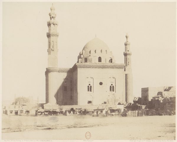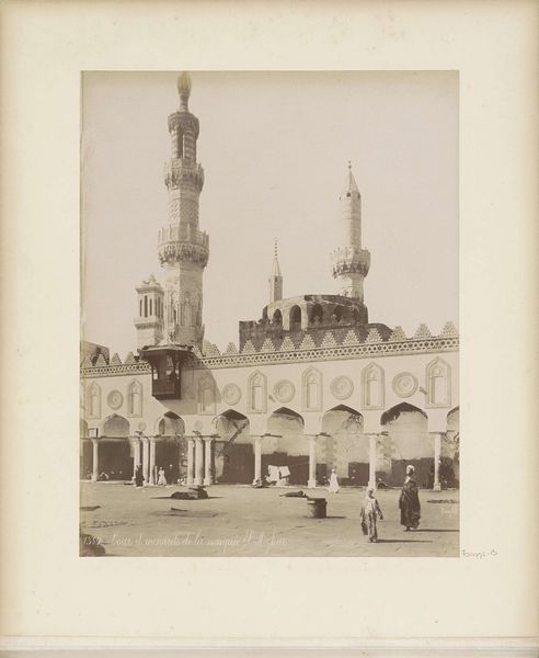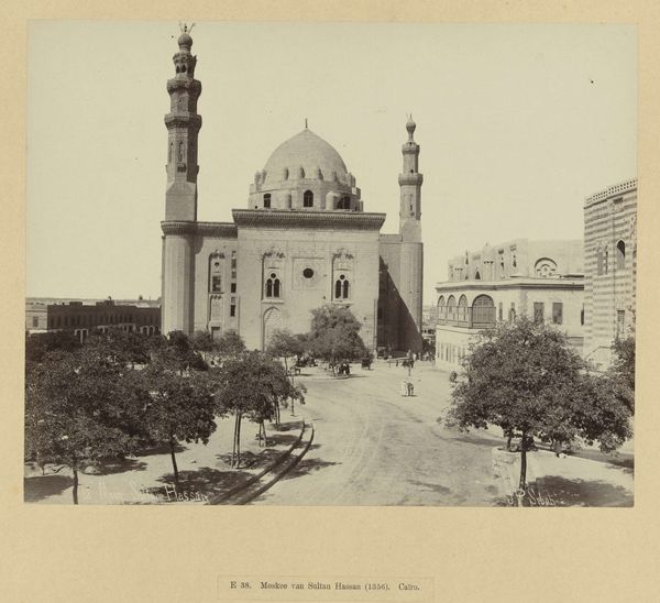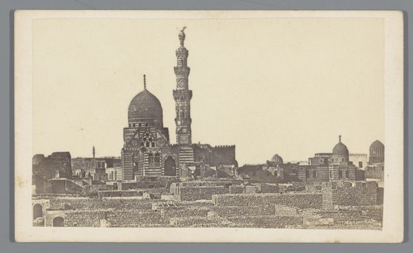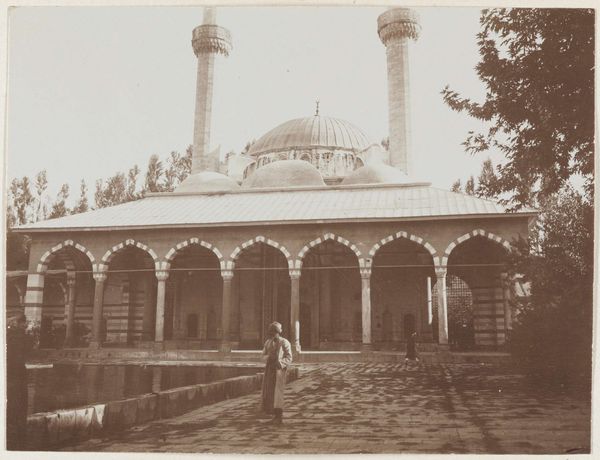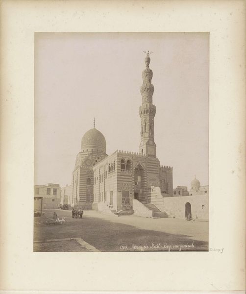 Curator: Good morning. I'm seeing delicate spires against an almost ethereal sky. It has an overall effect like an illustration from a fairy tale, although I imagine the reality was somewhat different. What is this beautiful building? Editor: We're looking at a late 19th-century photograph by Antoine Sevruguin, titled "Exterieur van de Fatima Masumehschrijn (Hazrat-e Masumeh) in Qom". Curator: Fatima Masumehschrijn... So, we’re seeing a shrine, a very imposing one at that. There’s a quiet grandeur here; everything seems carefully placed, even in a photograph that’s over a century old. Tell me a bit about it. Editor: Certainly. This print showcases the exterior of a significant Shia shrine located in Qom, Iran. It's not just a place of worship; it's a symbol of faith and a powerful architectural statement. Curator: The framing really emphasizes the architectural precision, but I wonder about the society outside. Were there political messages or intentions within such photographs during that time? Editor: Absolutely. Sevruguin operated during a period of immense social and political change in Persia. Photography became a tool for both documentation and, subtly, for negotiation between tradition and modernity. Images like this circulated among elites, and Western audiences, shaping perceptions of Persian society. Curator: It's amazing how photography can both freeze a moment and still convey movement – societal and spiritual. Those minarets must have appeared majestic! The amount of intricate detail on them alone is astounding. Editor: It's worth considering the role of museums and their evolving relationship with the display of cultural heritage like this. Photography enabled cultural exchange, but also power dynamics between colonizer and colonized, or between different groups within Persia. This photographic image allowed for greater access to it, or, maybe, imposed its own understanding of the Shrine onto a viewer far away from the holy location. Curator: I never considered the imposition aspect of viewing things out of context. Seeing the world through a lens not your own. I was initially drawn by its artistic rendering, a quiet visual pause in our often too fast lives. Thanks for bringing historical and socio-political nuances to the fore. Editor: Thank you! Considering these complexities enriches our appreciation, highlighting the multifaceted role that images like this play in society even now.