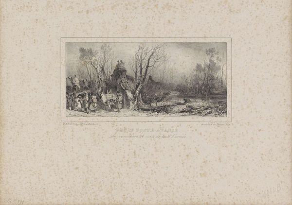 Curator: Here we have "Franse patrouille, 1832" by Nicolas Toussaint Charlet, created sometime between 1832 and 1833. It's a print, an engraving to be exact, that resides here at the Rijksmuseum. Editor: At first glance, I'm struck by its rather somber tone. The delicate lines and high contrast, born of its material process, give the whole scene a tense, almost ghostly air, wouldn't you say? Curator: Definitely, it speaks to the realities of 19th-century life. Charlet often depicted military scenes and everyday life with a blend of romanticism and realism, in contrast with the glorious scenes portrayed by state sanctioned works. You see a group of soldiers engaging with civilians near what seems to be a religious shrine. Editor: Which draws immediate attention to social relations; who has power, who does not? Given this was France after the revolution, what does it suggest about class and control? What about the material production of printed matter intended to circulate and inform French culture? Curator: He captures a poignant moment—a brief pause, perhaps during military patrol? There is a weariness about the figures, they almost blend into the landscape itself, don’t you think? Editor: Absolutely, the artist’s choices emphasize the laborers through meticulous labor: the detailed engravings making their existence material to us. But then who are the consumers of this artwork, and how are their values informed by Charlet’s images? Curator: Interesting points to ponder about patronage and distribution. For me, beyond all those socio-political elements, I see this humble moment where the lines between the protectors and the protected blur a bit, if even fleetingly, and for me the artistry captures those ambiguities beautifully. Editor: Yes, art like this reveals a crucial view into how art shapes reality as well as documents it; how production, consumption, and circulation come together. Thank you for taking us deeper into this piece.