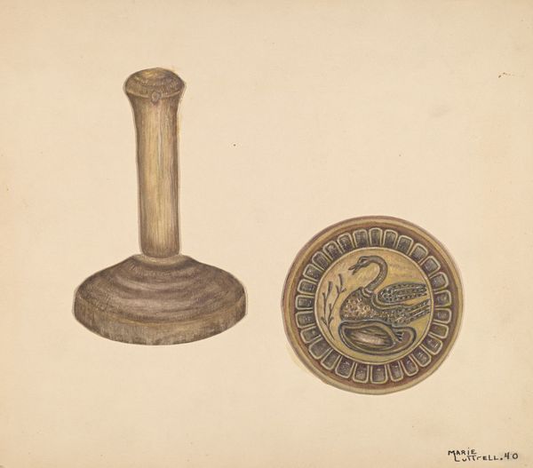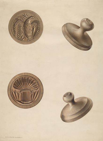 Curator: Look at this delightful study – "Butter Mold - Burr Design," created around 1937 by Lawrence Flynn. The simplicity, the elegance of it! Editor: Immediately, I'm struck by how much work is condensed in here. The intricacy of that floral carving on the mold contrasts so sharply with the tool’s utilitarian function, but the labor, both in reality and representation, isn't really disguised. Curator: Exactly! It's almost like a quiet ode to domestic creativity, isn’t it? It's just a pencil drawing, probably on paper, yet Flynn captures every detail. The texture of the wood, the gentle curves… it's like he's imbuing the mold with a certain personality, and its relation to food as pleasure and labour. Editor: Precisely. What’s interesting to me is the hidden-in-plain-sight element: an artisan, in their home maybe, taking up some craft to produce or enable new creations, which simultaneously reflects economic forces beyond its walls. We are so removed from hand making our dairy nowadays, but it’s fascinating how a simple kitchen utensil embeds narratives about our material needs. Curator: And that tension you're getting at is precisely the push-and-pull within folk art, between practical use and aesthetic beauty. The "burr" design isn't just decoration; it tells a story. There's something innately human about wanting to elevate even the most mundane object. What story might we imprint upon a butter mold in our own time? Editor: Oh, without a doubt it speaks to deeper traditions than we expect. And seeing this so delicately rendered, that level of precision for what must have been such a mass-produced object... well, it almost transforms the mold, doesn't it? Beyond functionality, beyond folk craft, and perhaps just hints at an enduring sense of artistry and invention tied to food. Curator: Yes, in many ways it encourages us to slow down, doesn't it? It forces a renewed interest, an encounter, a sense of tactility even! And ultimately to think about where things come from, and why. Editor: Exactly, the mold imprints an identity on something, like the mark of a laborer upon their product, only now also on its resulting form: the consumer good itself. Very potent commentary by way of a mold drawing from Mr. Flynn, isn't it?