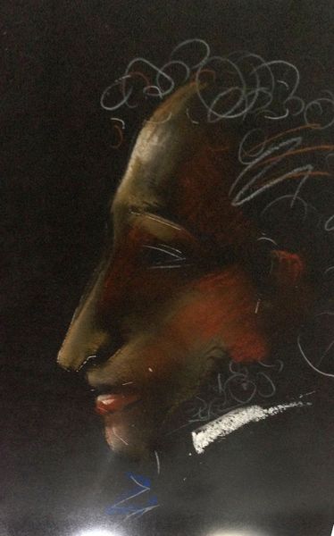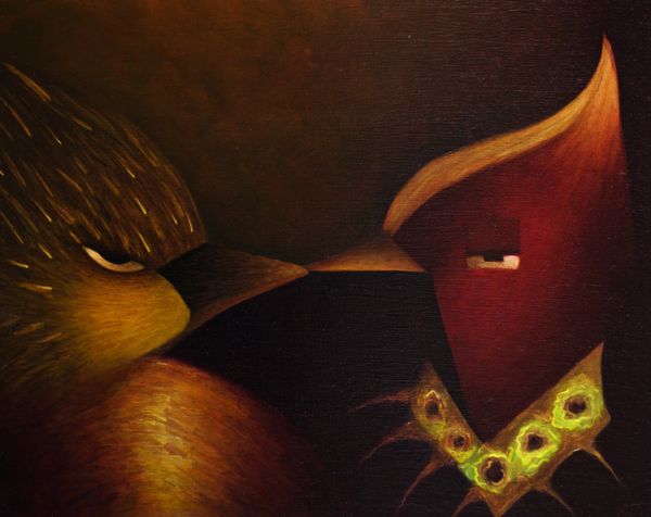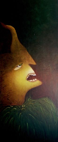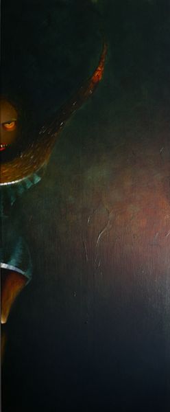 Curator: Okay, here we have "Aleijadinho Et Eius Proditores - Right Panel" painted by Paulo Tercio in 2014. Oil on… well, it certainly makes an impression! What are your first thoughts? Editor: Immediately striking – theatrical, even. The composition angles sharply upwards, pulling your eye along the figure. And the color… that acid yellow face against the murky ground feels so unsettling! Like a fever dream. Curator: Yes! It does lean into the surreal. It has elements of portraiture, but decidedly skewed. You see how the figure has this intense, almost caricatured expression, all sharp teeth and that singular, wide eye. Editor: Absolutely. The neo-expressionist brushwork contributes to this raw emotion. The materiality is really prominent, I notice the distinct strokes of the paint layering. It's so loose, yet it builds such a clear form. Curator: And the narrative is ambiguous, isn't it? “Aleijadinho Et Eius Proditores” refers to a famous Brazilian sculptor, and "Eius Proditores" translates as 'his traitors'. The painting presents, possibly, an allegory, exploring themes of betrayal or perhaps internal struggles within an artistic identity. Editor: I love the tension. Is this figure Aleijadinho himself, writhing in some kind of internal torment? That jagged collar reads as restriction, while the upward gaze suggests hope? Curator: Precisely. Or maybe desperation! I always get a visceral, emotional read on the face. Look at that horn-like feature – is it metaphorical or a sign of some grotesque transformation? Tercio pulls together recognizable forms, expressionist brushwork, but leaves the meaning deliciously elusive. It certainly demands your attention. Editor: Yes, and those subtle shifts in hue, particularly around the figure’s red garments, creates this unsettling feeling of…vibrancy. It draws you in and yet keeps you at bay. A challenging and really memorable piece. Curator: Yes, absolutely, I agree. It stays with you.