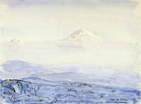 Editor: So, this is "Catania and Mount Etna," a watercolor and oil on paper created in 1847 by Edward Lear. The contrast between the dark, rugged foreground and the serene, distant mountain creates such a dramatic mood! What symbols and cultural layers are at play here? Curator: It’s quite striking, isn’t it? Think of Mount Etna itself: a powerful, almost divine presence in the Sicilian landscape. Volcanoes often carry layered cultural meanings – creation and destruction, beauty and terror, fertility and desolation, but in this particular view what does it stand for? Editor: Power, definitely, maybe also endurance? Catania has obviously survived its share of eruptions! Curator: Indeed! Consider the foreground – the volcanic rock. Those shapes aren't random. Rocks are building blocks and often appear to imply steadfastness, something foundational that has weathered much erosion in this region known for volatility. Does this interplay resonate in the depiction of Catania? Editor: I see what you mean. The town seems almost nestled, protected by both the mountain and the foreground, implying resilience, and maybe faith, as a way of life? Curator: Precisely. The snow-capped peak touches the sky, doesn't it? So that natural wonder acts like an anchor between this earthly space and whatever realm exists beyond what is observable. A silent force. And what could it possibly represent? Editor: A conduit? I guess, linking the groundedness of human experience with something, a bigger unknown, which gives me a new appreciation for the scene’s depth. Thank you! Curator: My pleasure! Seeing the connections helps us appreciate the landscape tradition itself – it's not just scenery, but also cultural memory etched in place.