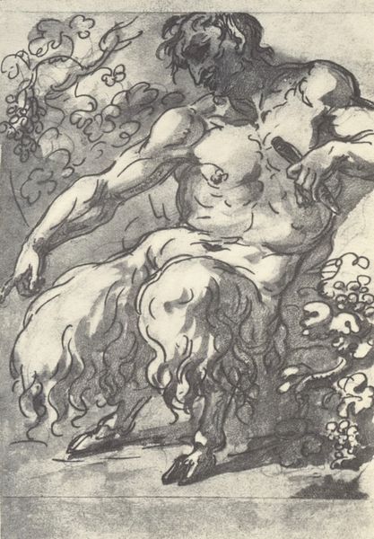 Curator: This is Jean-Honoré Fragonard's "Plate Three: Young Girl Astride a Satyr," a captivating drawing currently housed here at the Harvard Art Museums. Editor: It has such a playful dynamism; the figures seem to burst forth from the confines of the oval border. Curator: Indeed! The loose, spontaneous lines, characteristic of Fragonard's drawings, point to a freedom in the production process, where labor and playful subject matter converge. Editor: The swirling composition and the embrace of the figures, rendered with delicate strokes, invite the eye to dance across the surface. The textured materiality of the line work contributes to the sensory richness. Curator: Exactly, and if we consider the social context, such playful scenes, often involving mythological creatures, reflected the aristocratic taste for lighthearted entertainment during the Rococo period. Editor: It's a reminder that even seemingly frivolous art reflects the material conditions and desires of its time. I am glad that we can dive deep into the study of art making with such complex figures. Curator: Seeing it now, I understand how we can weave a story with material conditions of 18th century France. Editor: I appreciate how this artwork allows us to consider form and function in tandem, enriching our understanding of both.