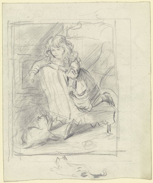 Editor: This is "The Farriers," a drawing by James Abbott McNeill Whistler. The scene feels so intimate, capturing a moment of labor. What symbols jump out at you in this drawing? Curator: The horseshoe, of course, is an ancient symbol—protection, luck, even fertility. Consider also the bent posture of the farrier – is it humility? Sacrifice? It speaks volumes about man's relationship with animals. Editor: That’s insightful. I hadn't considered the pose itself as symbolic. Curator: Whistler’s sketch captures more than just a profession; it hints at a deeper, almost primal connection with labor and animals. It reflects archetypes of strength, skill, and the enduring dance between humanity and nature. Editor: Thank you. I now see the artwork's cultural roots more profoundly. Curator: Indeed. Art often whispers secrets of shared pasts if we listen closely.