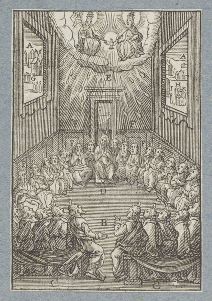 Christoffel van Sichem II created this woodcut titled "Annunciatie" in approximately the 17th century. The composition is neatly divided into celestial and terrestrial zones, each teeming with figures rendered in precise detail. The stark contrast of black lines on the pale background gives the print a striking visual intensity. Looking closely, one observes how Sichem uses line and form to structure a semiotic relationship between heaven and earth. The upper arc is filled with angels and divine symbols, emphasizing a sense of ethereal transcendence. Conversely, the lower section depicts human figures with a greater emphasis on grounded, earthly qualities. The balance achieved through this formal structure effectively communicates the theological narrative of divine intervention in the human world. Note how the graphic nature of the woodcut serves to flatten the perspective, thereby emphasizing symbolic representation over realistic depiction. This challenges conventional modes of representation and offers a complex interpretation of religious dogma.