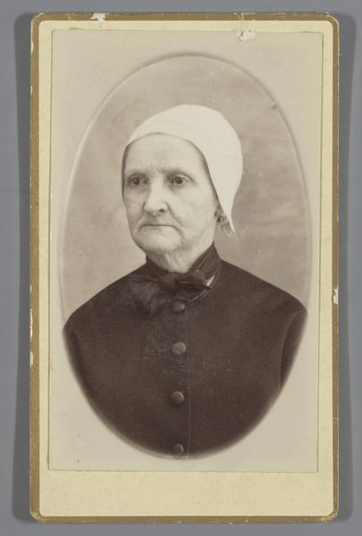 Curator: This photograph, entitled "Portret van een onbekende oude vrouw", translating to "Portrait of an Unknown Old Woman," was produced sometime between 1865 and 1880 by Otto Pettersson & Co. Editor: The photograph has an incredibly subdued tonal range, evoking a sense of profound solemnity and timelessness. Curator: Indeed. Note the intricate details captured within the frame, the deliberate construction of light and shadow that articulate the subject's facial features. Observe also how the head covering, immaculate and striking against the simpler dark clothing, serves to concentrate attention. Editor: Speaking of the garments, I am struck by the clear demonstration of skilled labour represented. It invites a deeper consideration of the material conditions that made possible both the photographic practice and the woman’s life circumstances during the era. What labour was necessary to produce these articles of clothing, and how does that contrast with its perceived simplicity? Curator: The medium, too, offers insight into societal function, with photography beginning to proliferate in the mid-19th century; here we see a moment captured and rendered permanent. Furthermore, there is the technical ability to master this complex medium—photography offered new opportunities for those like Pettersson, and by considering such portraits, the development of studio practice is unveiled. Editor: I agree, the choice to capture and disseminate this image by Pettersson—the very means of distribution—informs us on how certain aesthetics of that era were both created and celebrated. Consider also the economics of that labour, especially within the domestic sphere—its effects cannot be understated. Curator: Considering how the composition leads the eye, this close study invites a reflection upon the photograph's formal power and also suggests narrative possibilities for the attentive observer. Editor: It is in these details that a social story is presented; an examination of technique, labour and material—inviting dialogue and contemplation regarding her era. Curator: Precisely. By uniting formalism and material examination, we allow greater understanding and the unfolding of social reflection. Editor: Indeed, this union, I believe, offers invaluable avenues for us to meaningfully explore both aesthetics and social insight in this enduring form.