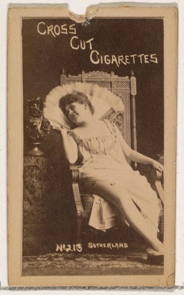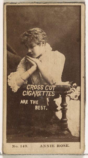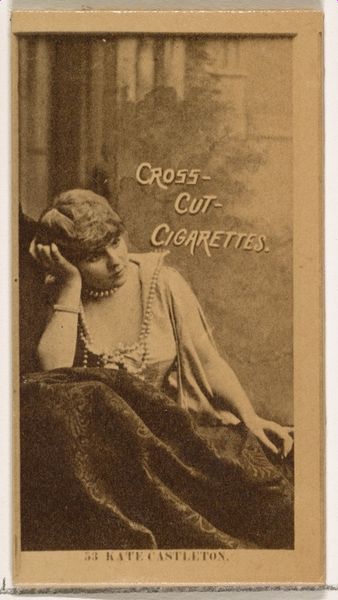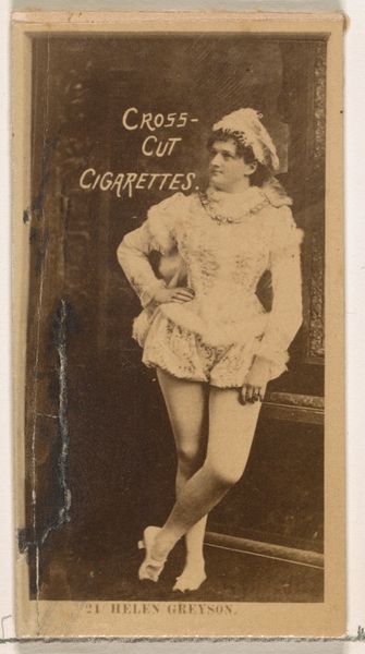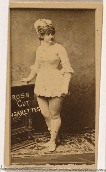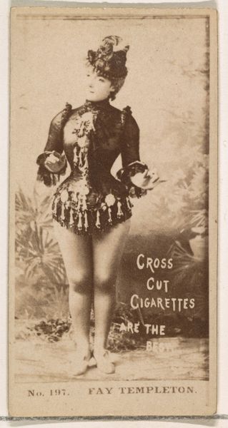 Editor: This is “Card Number 47, Miss De Sortes,” a print from the 1880s, part of the Actors and Actresses series, by W. Duke, Sons & Co., a promotional piece for Cross Cut Cigarettes. She seems almost ethereally poised, but knowing it was tied to cigarette marketing feels a bit… strange, doesn't it? What's your take on this juxtaposition? Curator: Ah, the dance of commerce and culture! What appears to be a delicate portrait is also a potent reminder of a different time. This was before stringent advertising regulations, a world where a ballerina could easily be employed to sell vice. It reminds me of old circus posters - beautiful images for tawdry realities. The photo has a wistful sepia tone, a hazy beauty…doesn't that give it an otherwordly feel for you, too? Editor: Definitely! It almost softens the edges, both literally and figuratively, masking the crass commercial purpose. But I wonder, does that make it complicit, or does it transcend that origin through its artistic merit? Curator: Ooh, an existential dance of our own! I lean toward transcendence, if only because it prompts such questions in us today. Look at the way her hands are posed, the demure expression; the framing itself elevates her beyond a simple product endorsement. Plus, the very act of preservation elevates it, now a museum object more than advertisement, doesn’t it? It's an object reborn, reinterpreted through our modern eyes. What was vice now tells us about both commerce and performance. Editor: You're right; it's layered with meaning and beautifully ambiguous. I'll never look at an old ad the same way again. Curator: Wonderful! Now, go dance into the light, my friend, and continue unearthing beauty, even in the unexpected corners.