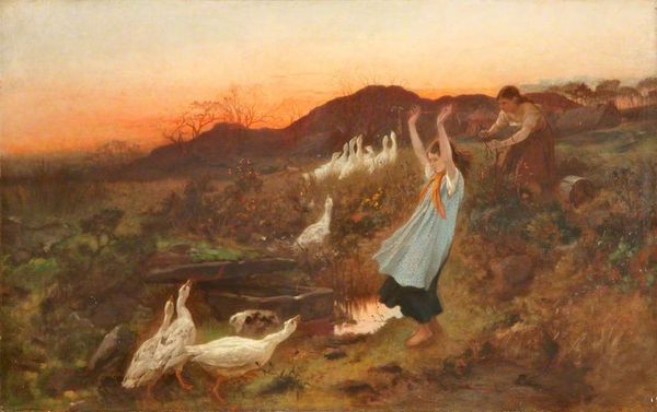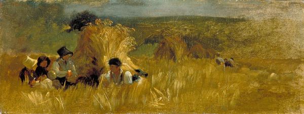 Editor: This painting is "Nightfall (The Gleaners)" by Henry Herbert La Thangue, made in 1895. The medium appears to be oil on canvas. The figure carrying wheat, dominates the canvas. The colour palette feels subdued, evoking a sense of melancholy. What structural elements define the viewing experience? Curator: Notice how the composition pivots on a distinct contrast. The foreground is swallowed by near-total darkness. The woman becomes a dark shape in front of this void. A counterpoint in the moon, and its impact on the gold wheat she carries creates strong horizontal line. Editor: So the line directs how we engage? Curator: Precisely. And the contrast with the shadows amplifies the texture, making each stroke visible despite the dim light. It becomes as important as subject matter, pushing what could be another rural scene. The mixed media supports La Thangue to make his artistic innovation a tangible characteristic of the image. How do you perceive the scale in relation to this texture? Editor: It’s interesting you point out the scale. The way it contrasts the labor portrayed in Romantic landscapes... I see a real break between conventions. Curator: Precisely. The texture here isn't just descriptive; it challenges Romantic notions through its density, creating the subject instead. We see the artist's manipulation becoming an essential part of meaning. Editor: I see how form dictates feeling and what is left for us to consider. Thanks! Curator: And how closely the artist works with, and departs from, prevailing structural principles. A valuable insight, I hope!