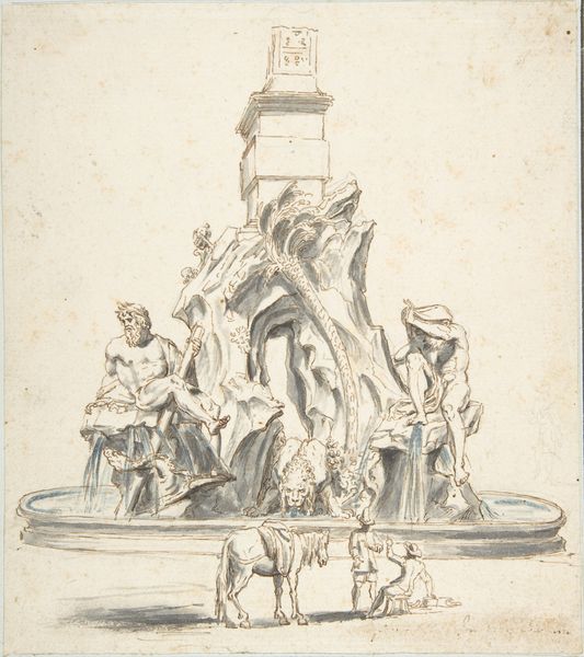 Joseph Nollekens created this design for "The Three Captains Memorial" with pen and grey ink, watercolour, and graphite. The memorial presents as a constructed tableau, a layering of symbolic figures against a stark blue pyramidal backdrop. The composition employs a classical language, using allegory to convey themes of honour and remembrance. Note how the linear precision and the calculated arrangement of figures—from the reclining river god to the winged Victory—create a sense of order. The monument is structured around a clear hierarchy of forms, which may reflect the period's emphasis on reason and order. The use of watercolour allows for delicate gradations of light and shadow. This enhances the three-dimensionality of the figures, giving them a sculptural presence even on paper. The drawing does more than represent an aesthetic form, it encapsulates and questions the period's values and aesthetic ideals.
